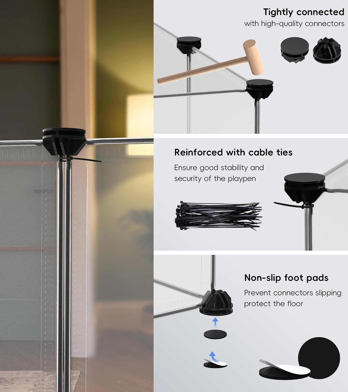 • Stability and Protection: Equipped with 42 nylon straps to securely fasten the small pet fence, and 14 anti-slip mats to prevent the fence from sliding on the floor, providing a stable play area for your pets.