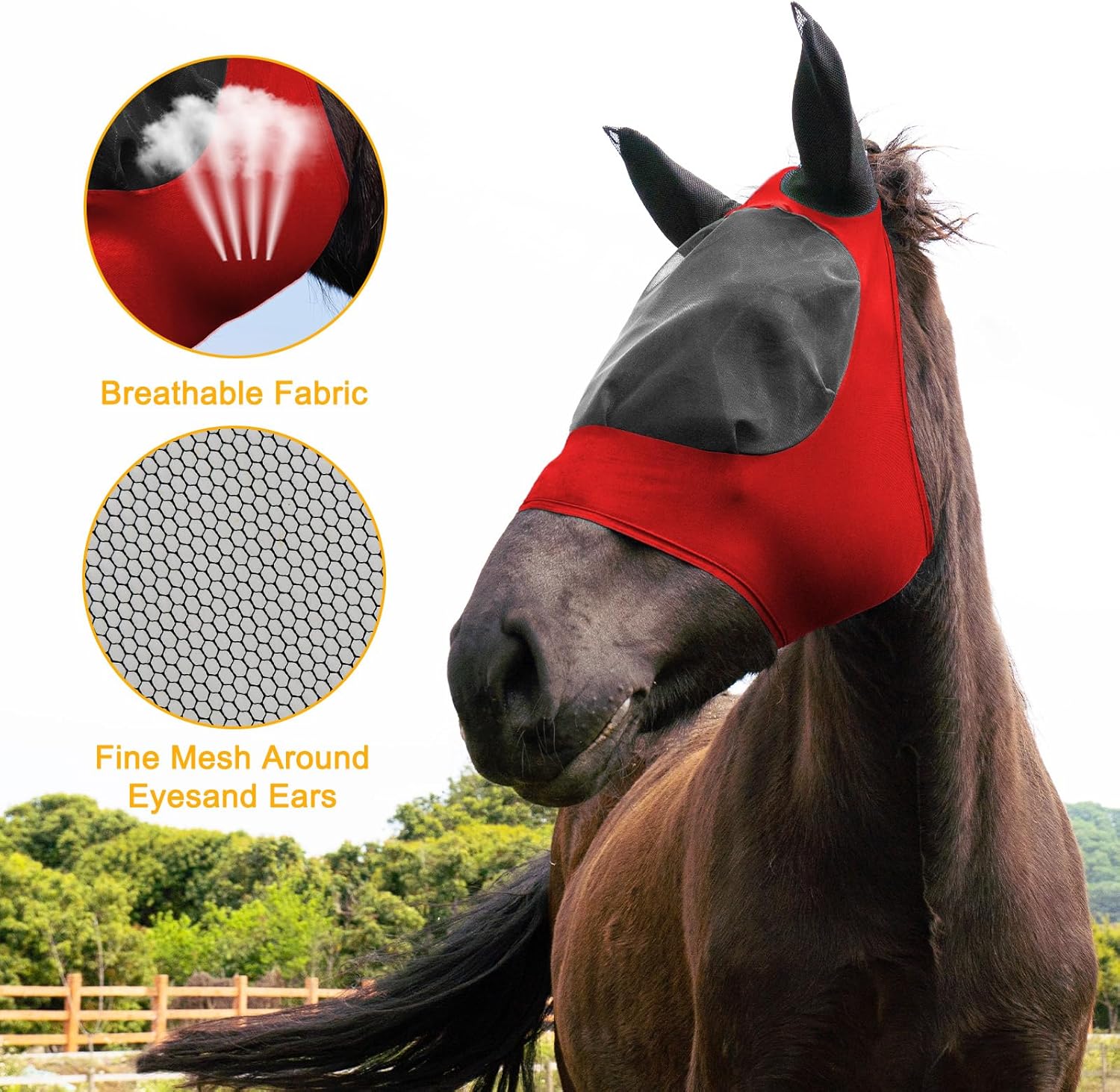 2 Piece Horse Fly Mask with Ears, Comfortable Fit Stretch Fabric Big Eye Space Soft Breathable with UV Protection for Full Horses (Red-Black)