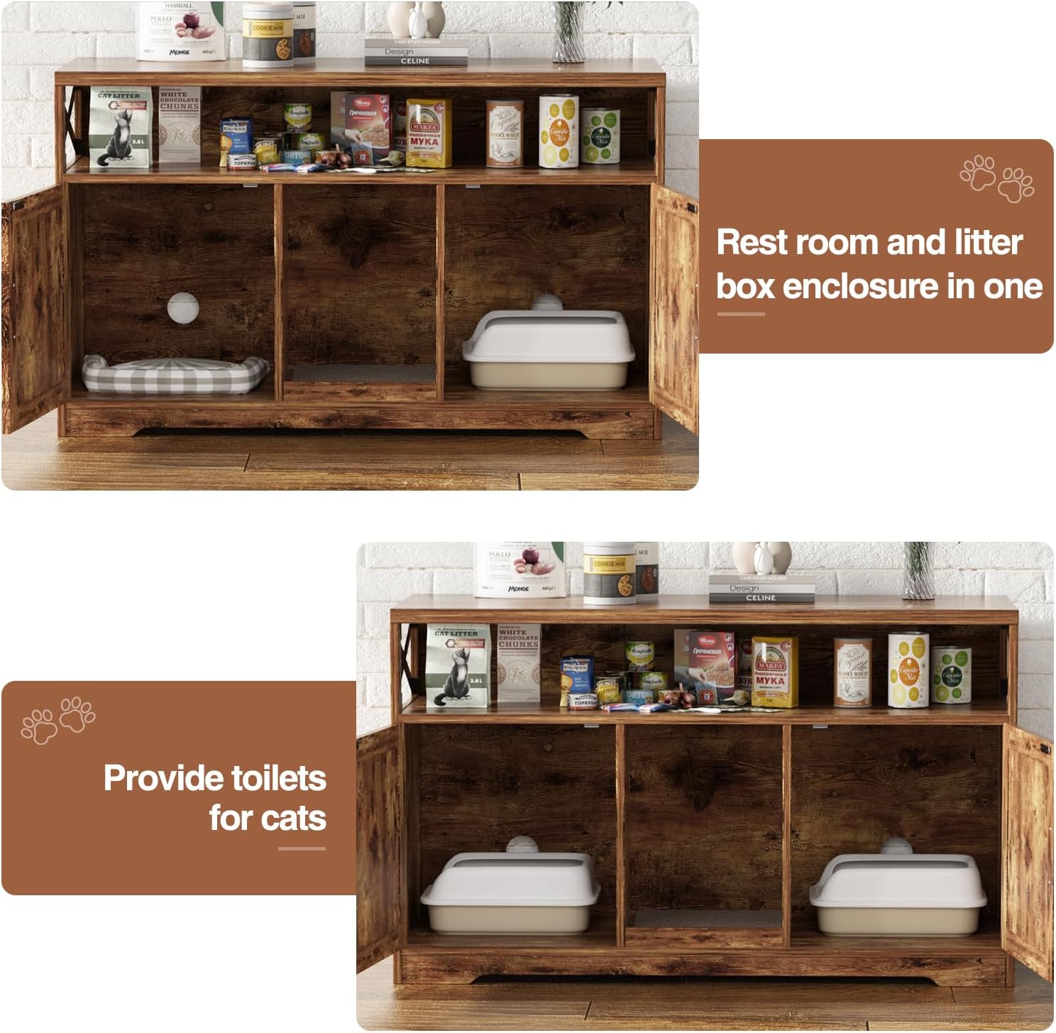 • Double Cabinet for 2 Cats: The 2 cabinets hold litter boxes or cat beds for 2 cats. Or both for one cat: one side for a litter box, the other for a cat bed. Our multi-functional cat box enclosure is designed with a spacious countertop and open storage compartment, perfect for storing pet food, toys and home decor.