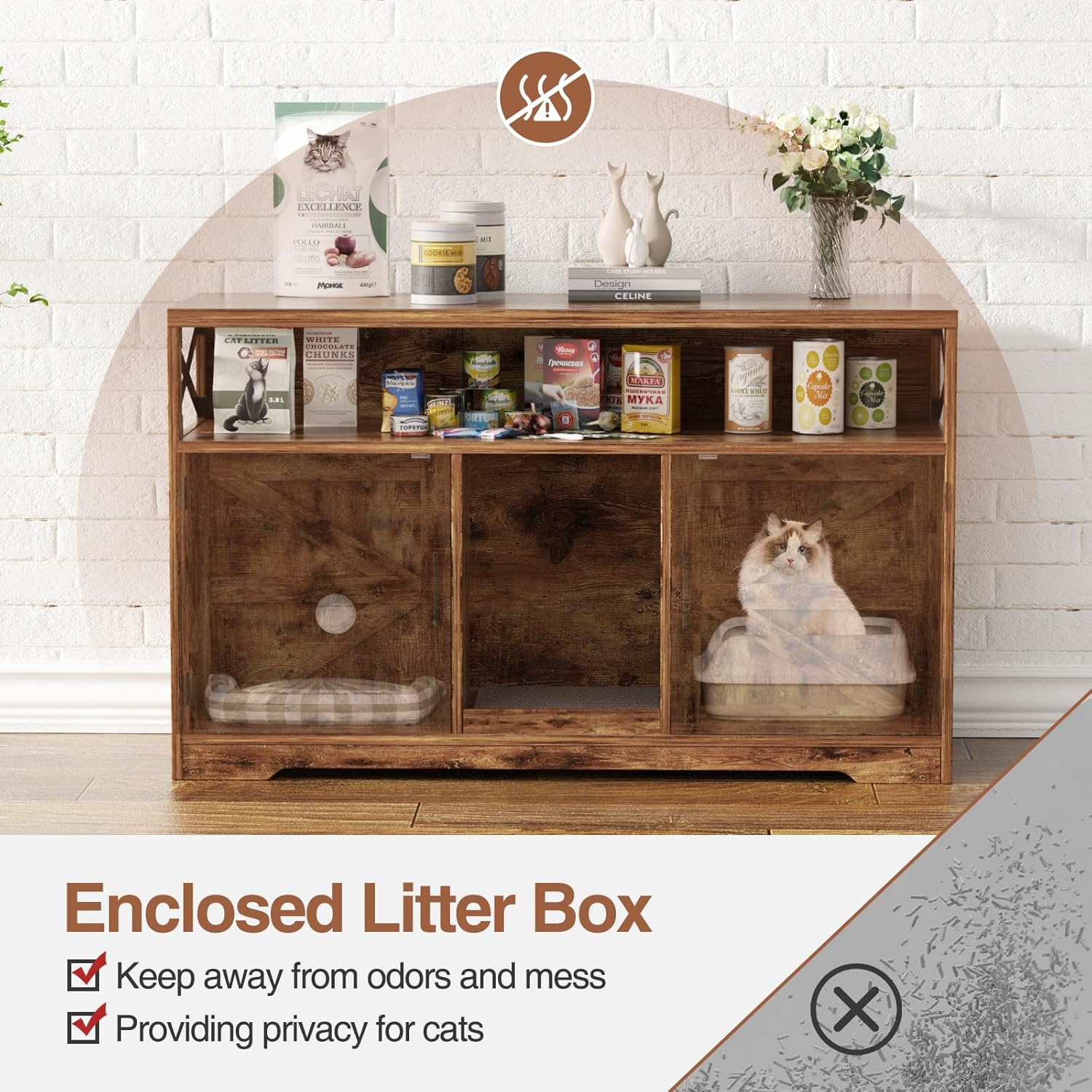 Cat Litter Box Enclosure for 2 Cats, 47" Double Hidden Litter Box Furniture with Scratch Pad, Farmhouse Indoor Litter Box Cabinet Cat Washroom, Rustic Brown