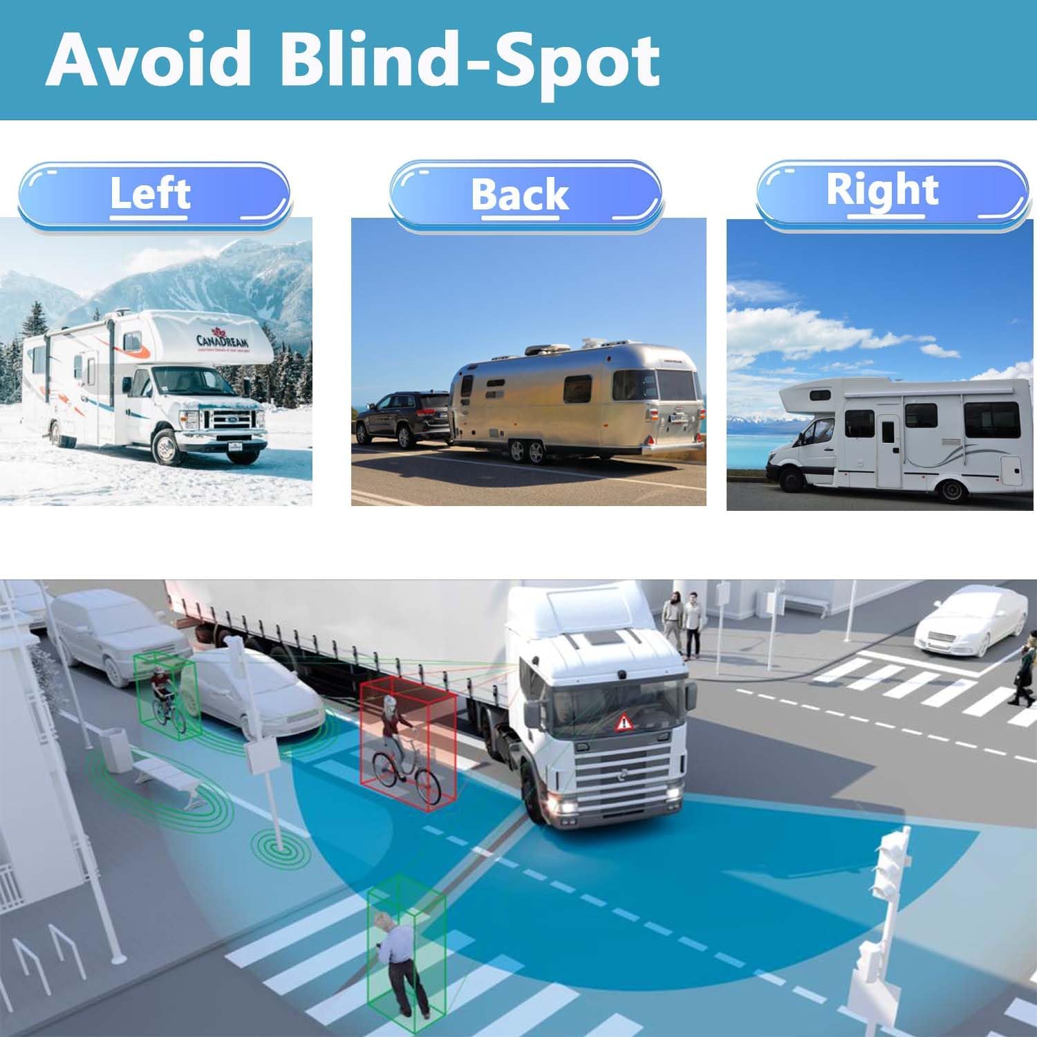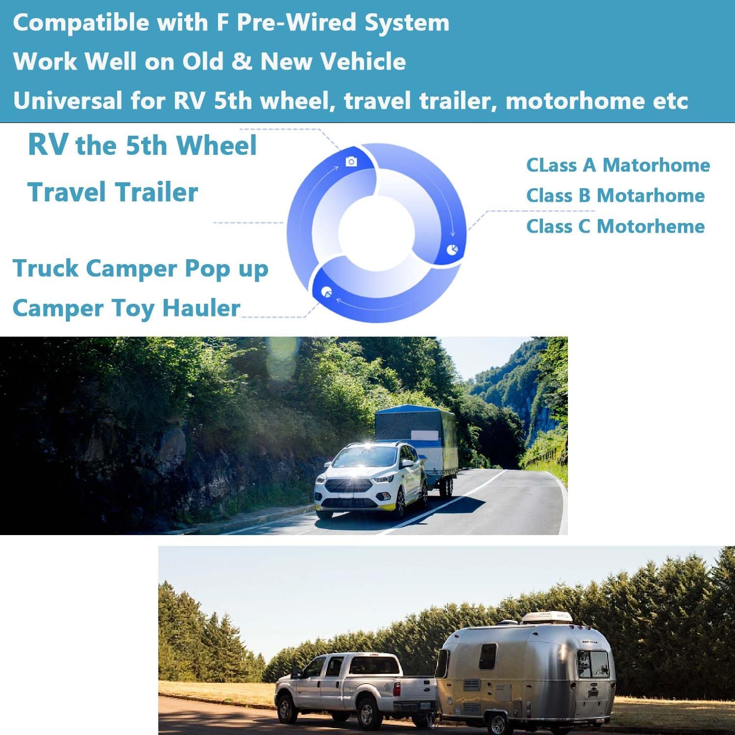 • Touchable 10.36 inch 4K Monitor:Wide 10.36 inch Screen,so we can observe 100% road situation.Larger screen,safer driving.2 split screen,2 channels,2 different angles help us to get a 360 degree view.For rear,parking, front, side,left,right,hitch,turn signal view.We also can choose the monitor to display 1/2 cameras' image.We can drive confiedntly.