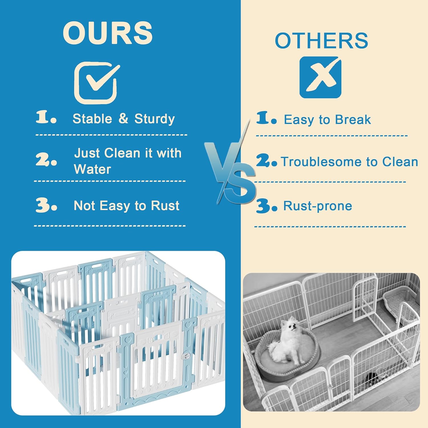 • DURABLE MATERIAL: Made of HDPE resin, our dog pens outside is safe, odorless, and durable. It's also chew-proof and gentle on your pet's skin. With this playpen, your dog can safely enjoy his time exploring and playing.