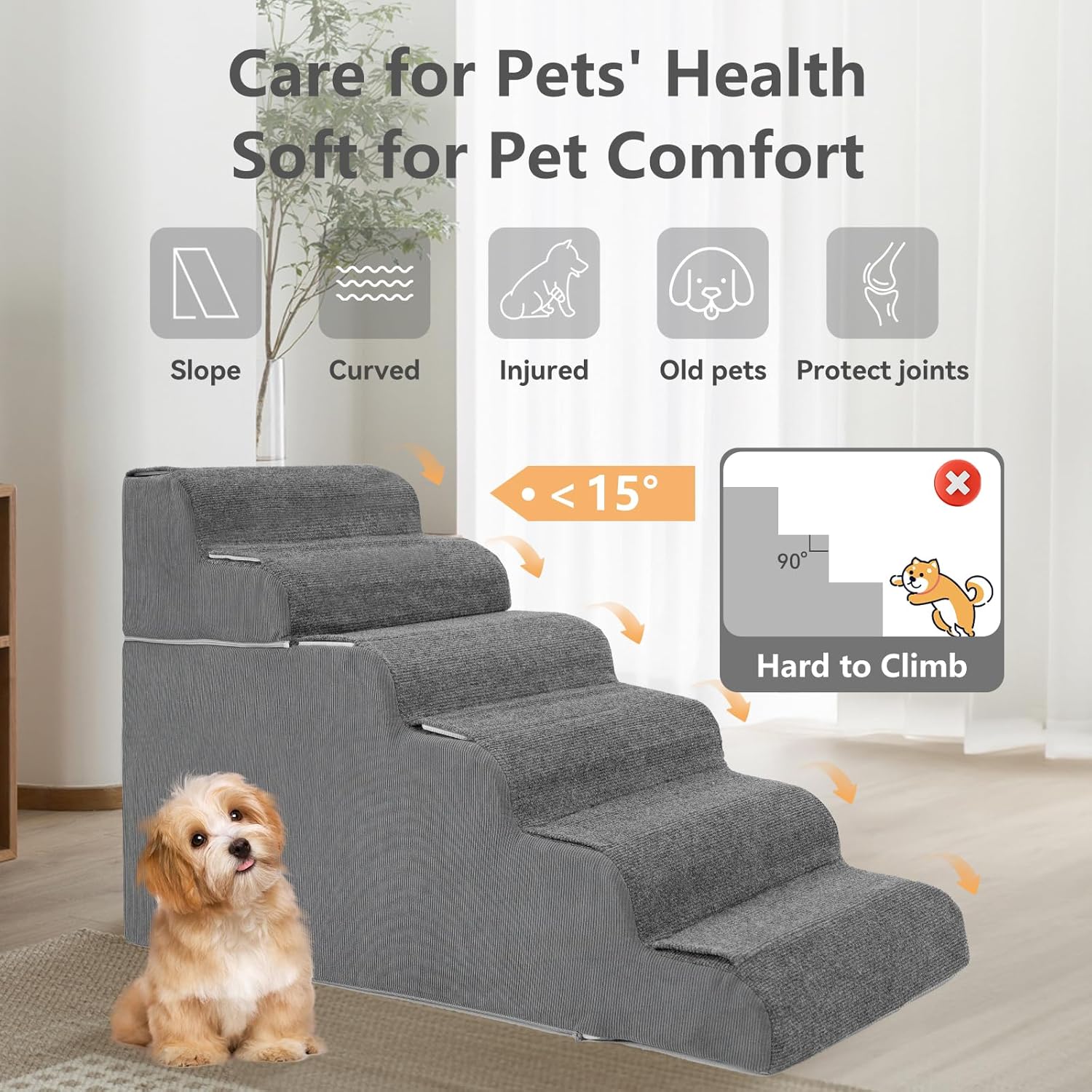• Customizable Height for Every Adventure: Our dog stairs with 6-step and 7-step designs ,which is uniquely crafted to adapt to your pet's needs. The modular design allows for easy assemblyโ€”simply zip or unzip the sides to create a 4+2 or 4+3 configuration. Whether your pet needs a gentle incline or a higher climb, these stairs grow with them, offering comfort and confidence every step of the way