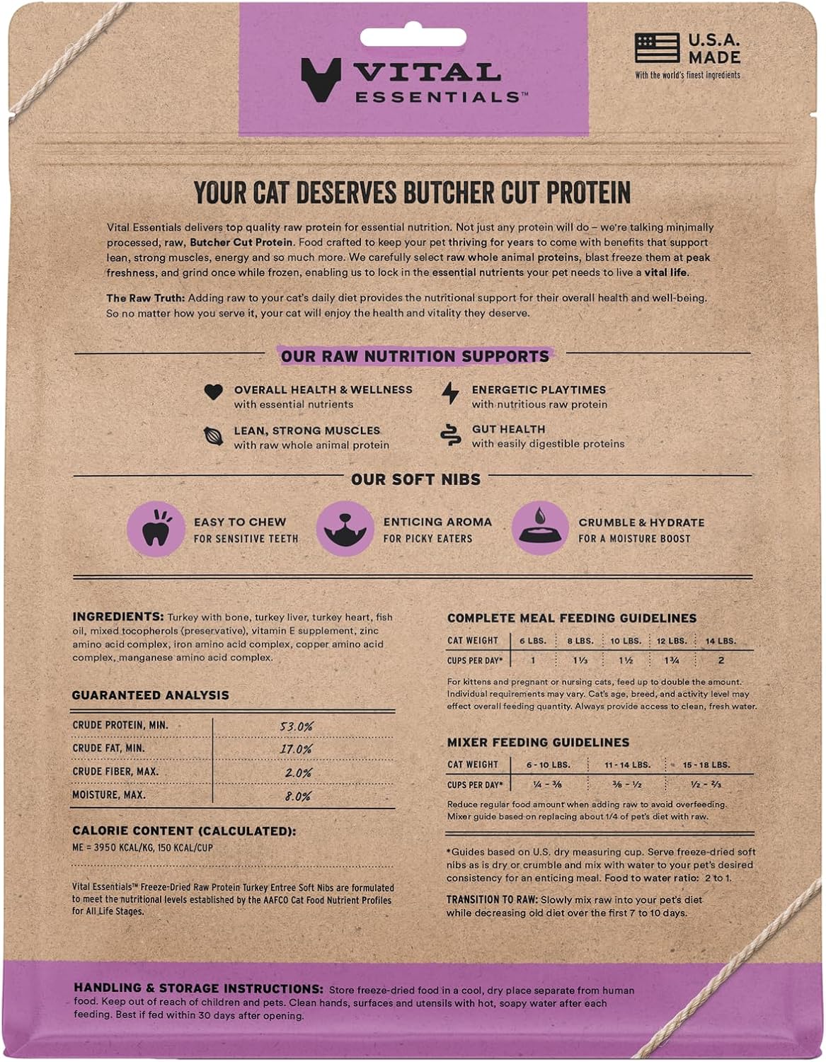 • SOFT NIBS FREEZE-DRIED RAW TURKEY CAT FOOD: Vital Essentials Freeze Dried Cat Food packs more protein than industry standard into every soft bite to deliver the peak vitality your cat deserves, especially when compared to dehydrated cat food. Our complete and balanced freeze-dried raw cat food is made with Butcher Cut premium turkey, responsibly sourced in the USA.