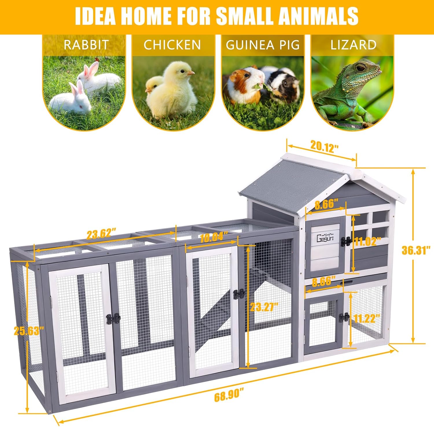 GEGURI Large Rabbit Hutch Indoor Outdoor Chicken Coop Wooden Bunny Cage with Waterproof Roof