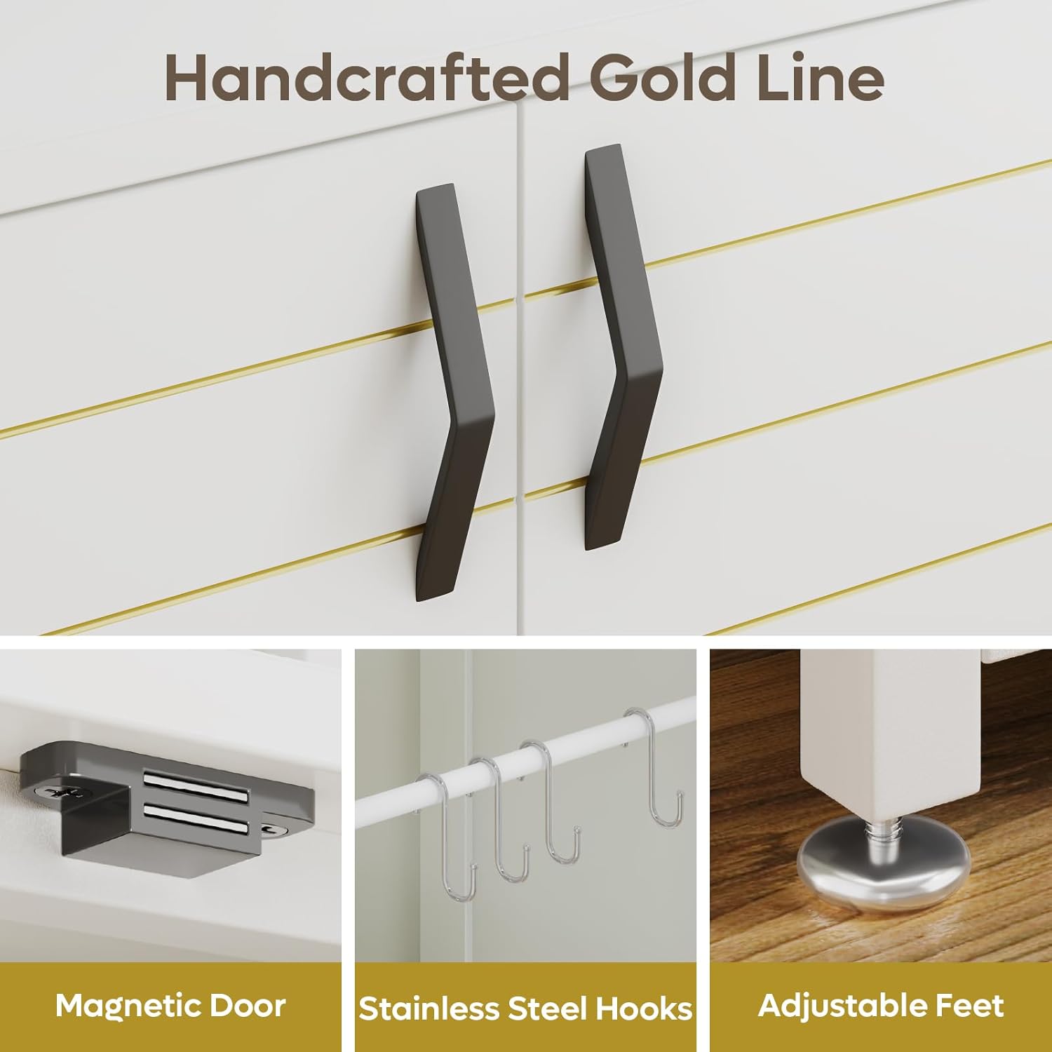 Bestier 20-29 Gallon Fish Tank Stand with Power Outlets, Metal Long Aquarium Stand with Storage Cabinet, 31x15 Reptile Terrarium Stand with Horizontal Gold Line, Stainless Hooks, 350 Lbs(White)