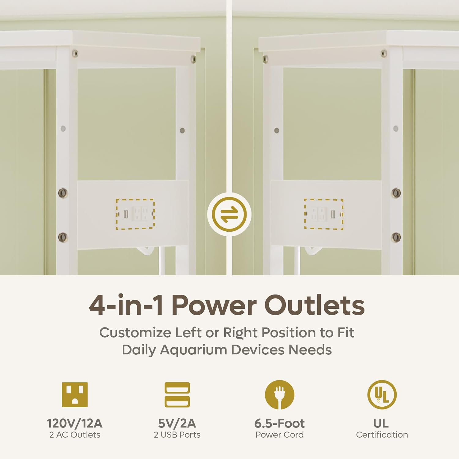 • 4-in-1 Power Outlets: The 29 gallon fish tank stand includes 2 AC and 2 USB outlets, installable on either side for flexible cable management, ideal for powering filters, lights, heaters, and charging devices