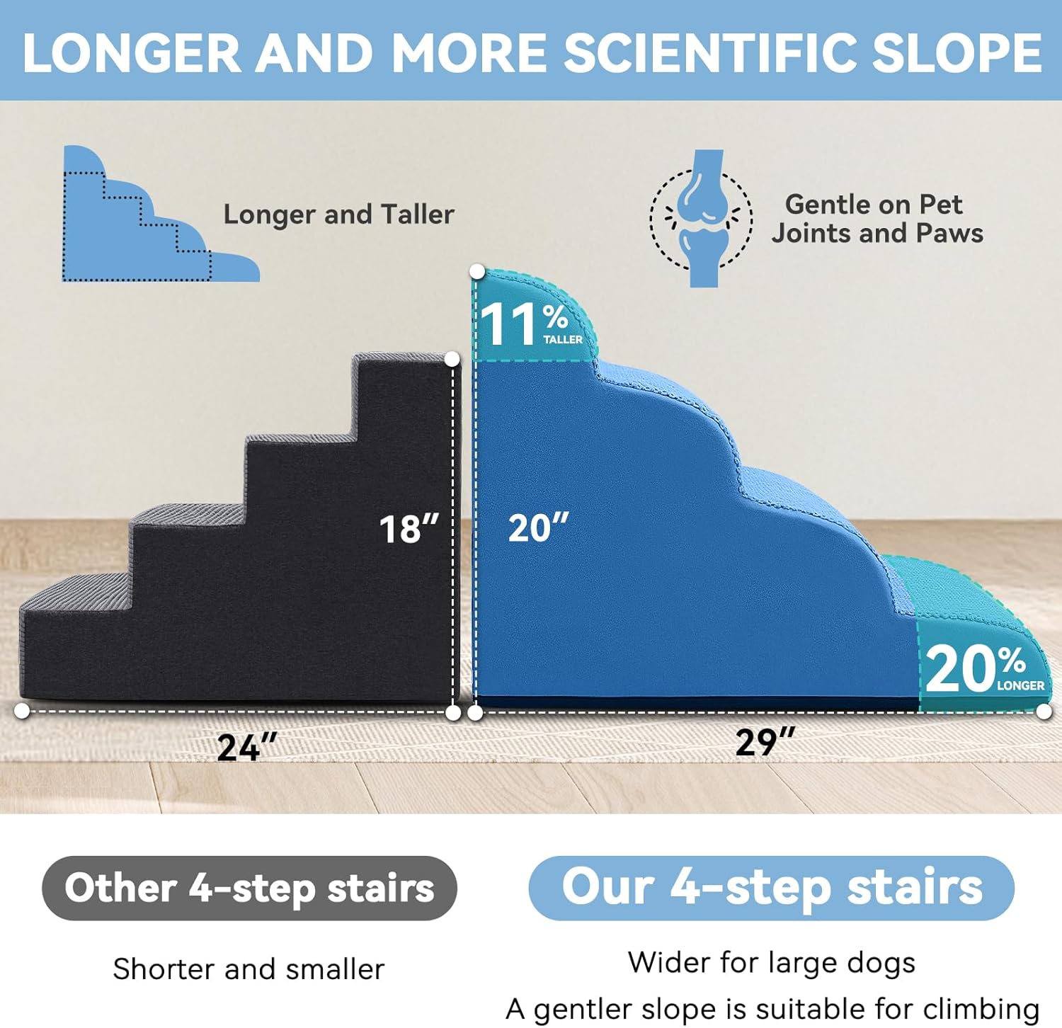 - Multi Sizes Fit Every Need: Zerbuger foam dog stair is not suitable for large dogs, please use it for pets under 50lbs! 3-steps are suitable for chairs and couches up to 20inch, 4-steps are suitable for high sofas, beds and window up to 25inch. Please confirm whether the size is suitable for your love pet first.