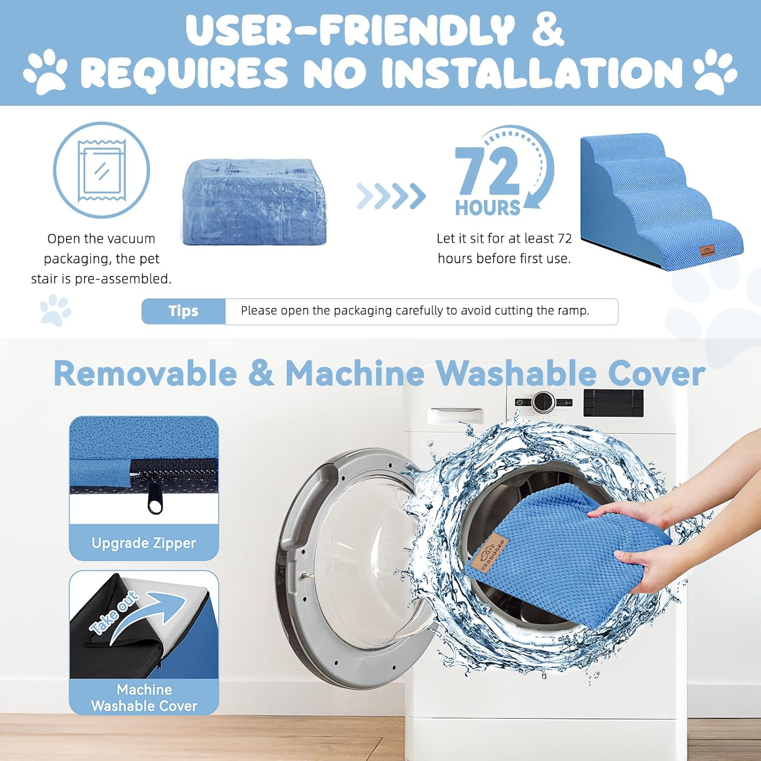 - No Assembly Required & Easy to Clean: When you open the packaging, the pet stair is already assembled. Before the first use, it should be left standing for at least 48-72 hours for the foam to fully expand. NOTE!! Open the packaging carefully to avoid cutting the stair! The outer cover can be removed for cleaning and supports machine washing or hand washing. Please note that the inner foam is not washable.