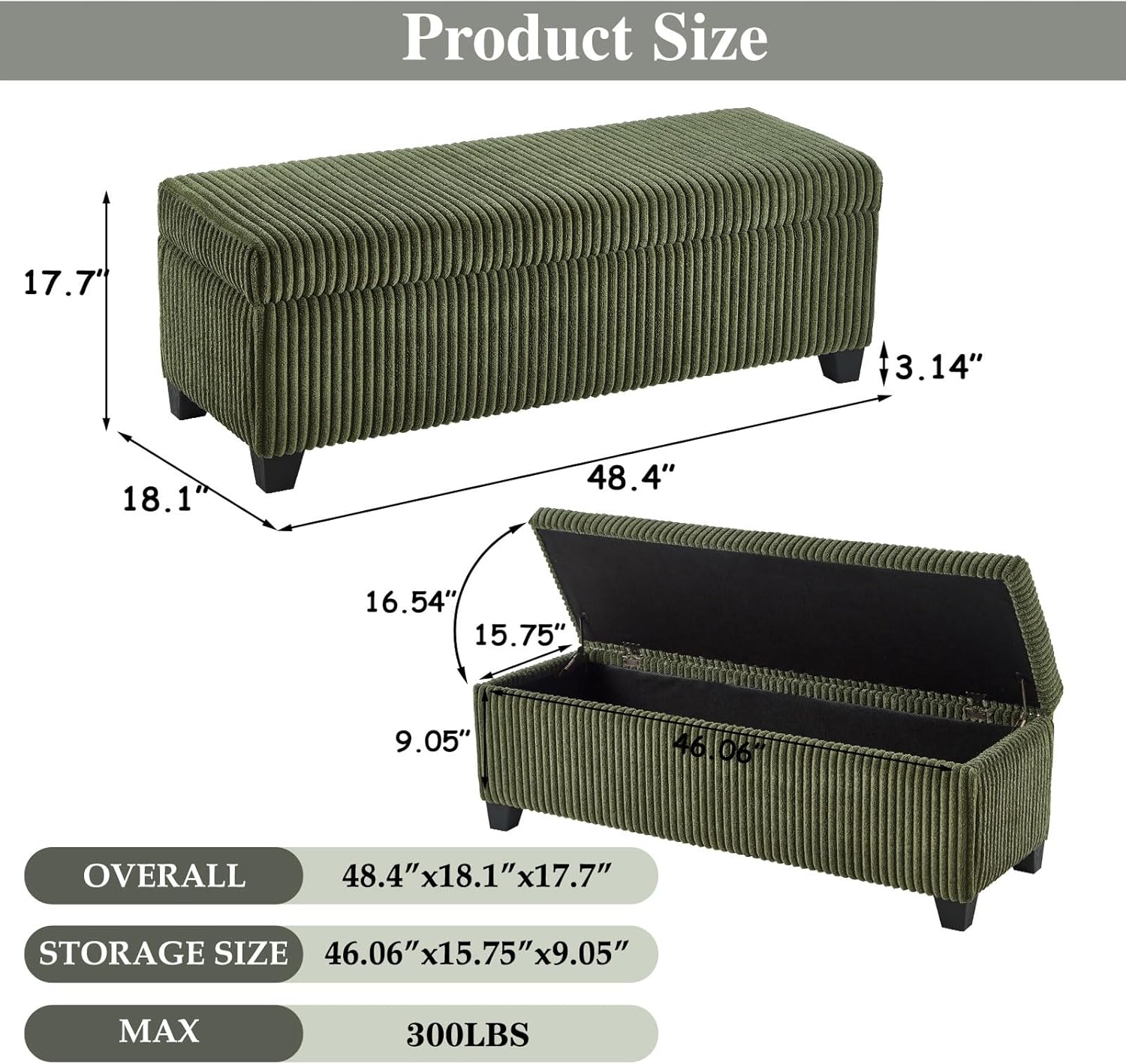48" Green Ottoman with Storage, Corduroy Storage Ottoman Bench for Bedroom, End of Bed Bench with Safety Hinge for Living Room, Entryway