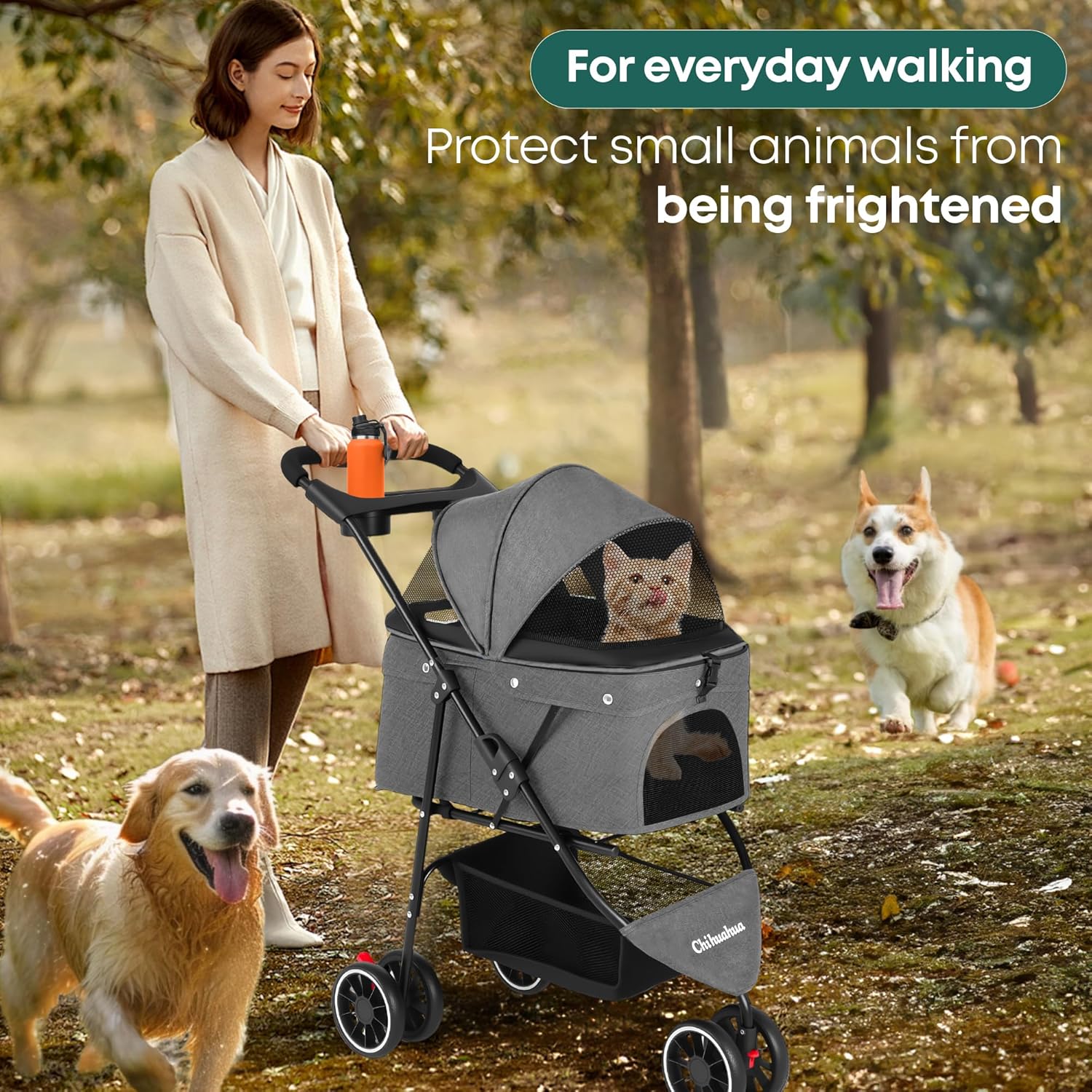 Pet Stroller,Dog Stroller for Small Medium Dogs Cats,3 Wheels,Foldable,with Breathable Mesh Canopy,Cup Holders,Easy Assembly,Grey