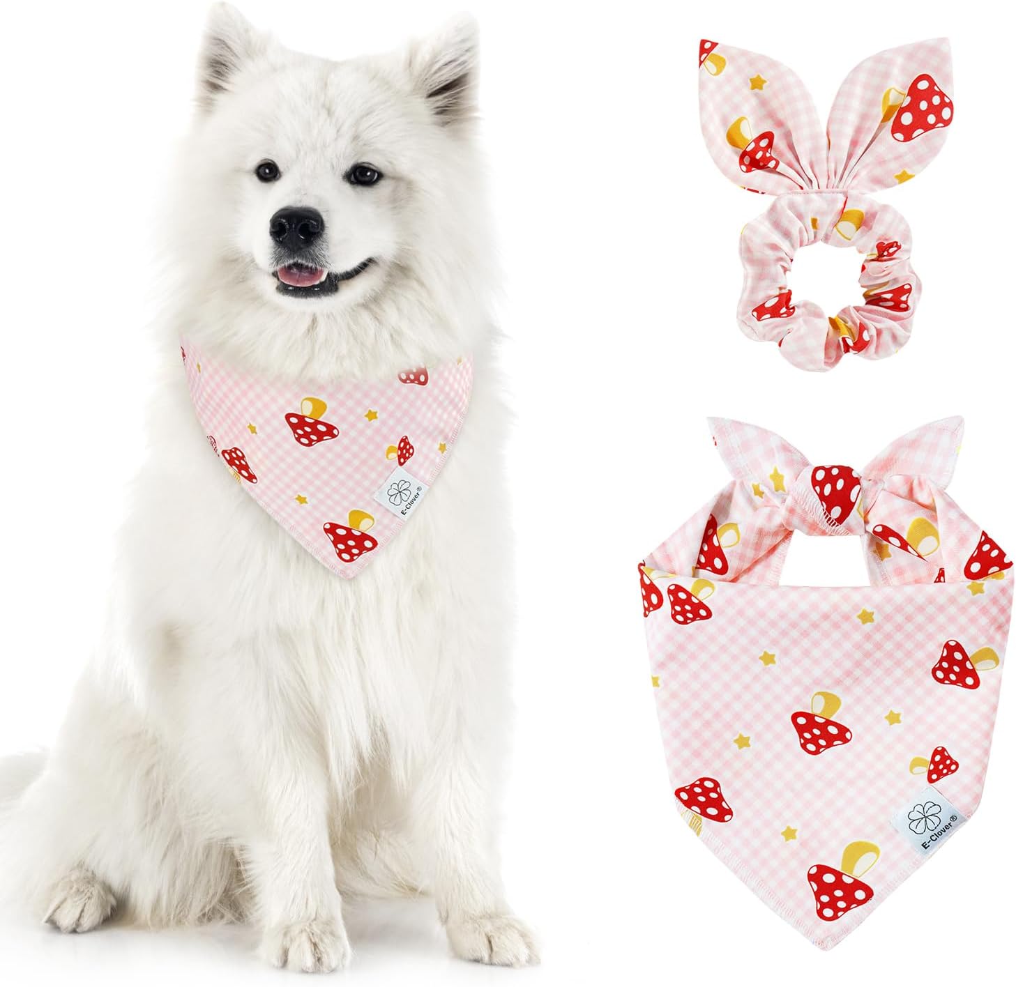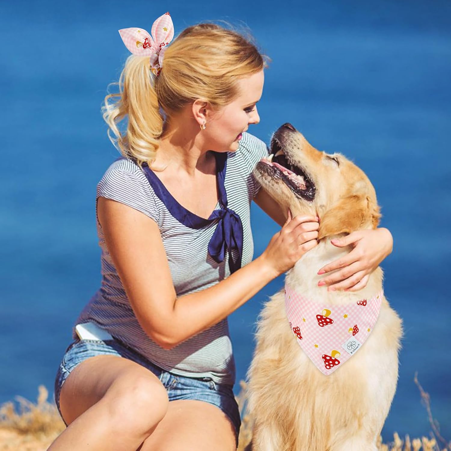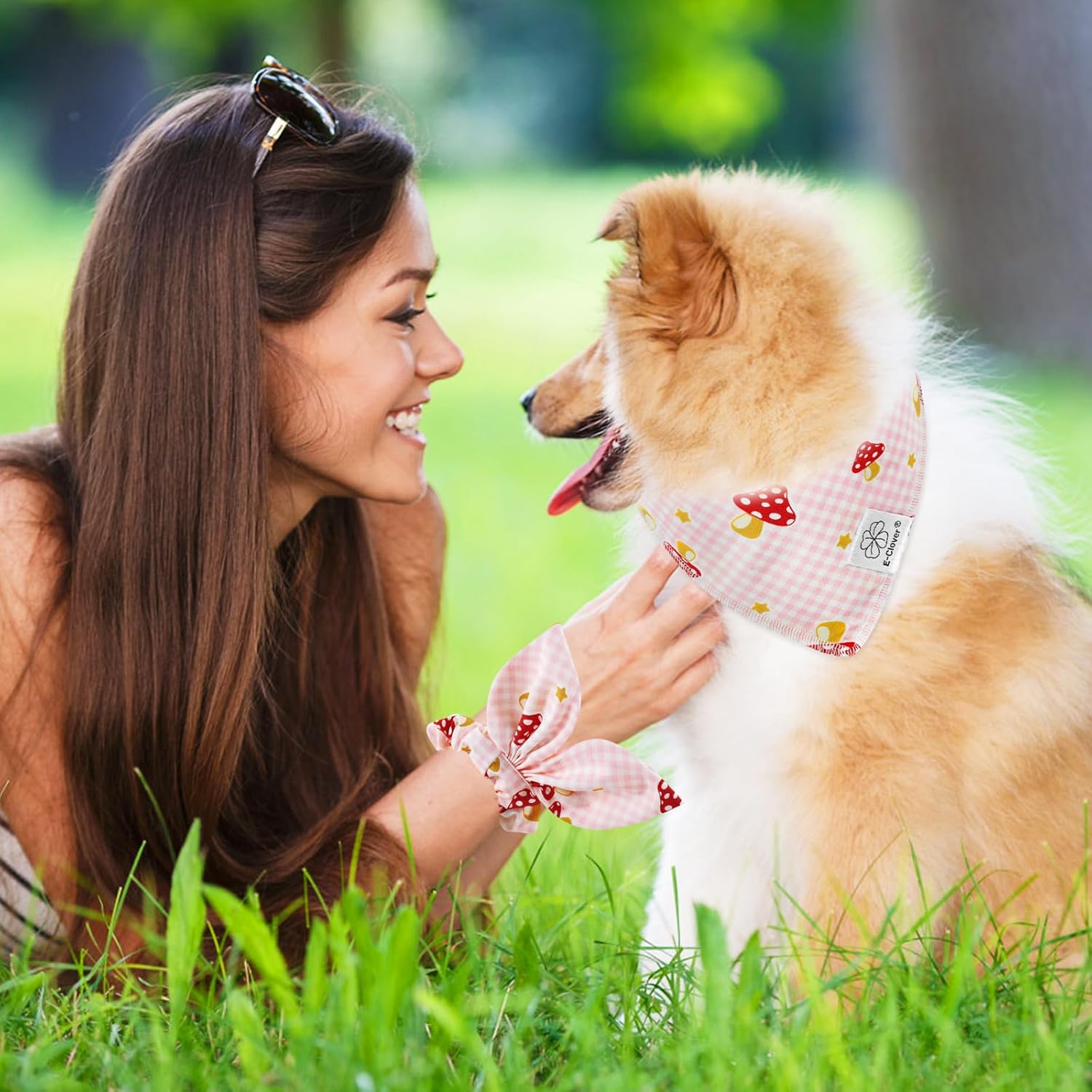 • Matching Bandana and Scrunchie Set- It’s full of love when your pets is wearing the pink plaid bandanas and you are wearing the bow scrunchies. When traveling, sleeping, taking photos or daily warking, adorable dog spring bandana and scrunchie is a pretty accessories. The the hair tie can be worn as a wrist accessory and hold your hair. Beautiful dog drool bibs and scrunchie with pink buffalo plaid and mushrooms pattern, it’s nice photo props.