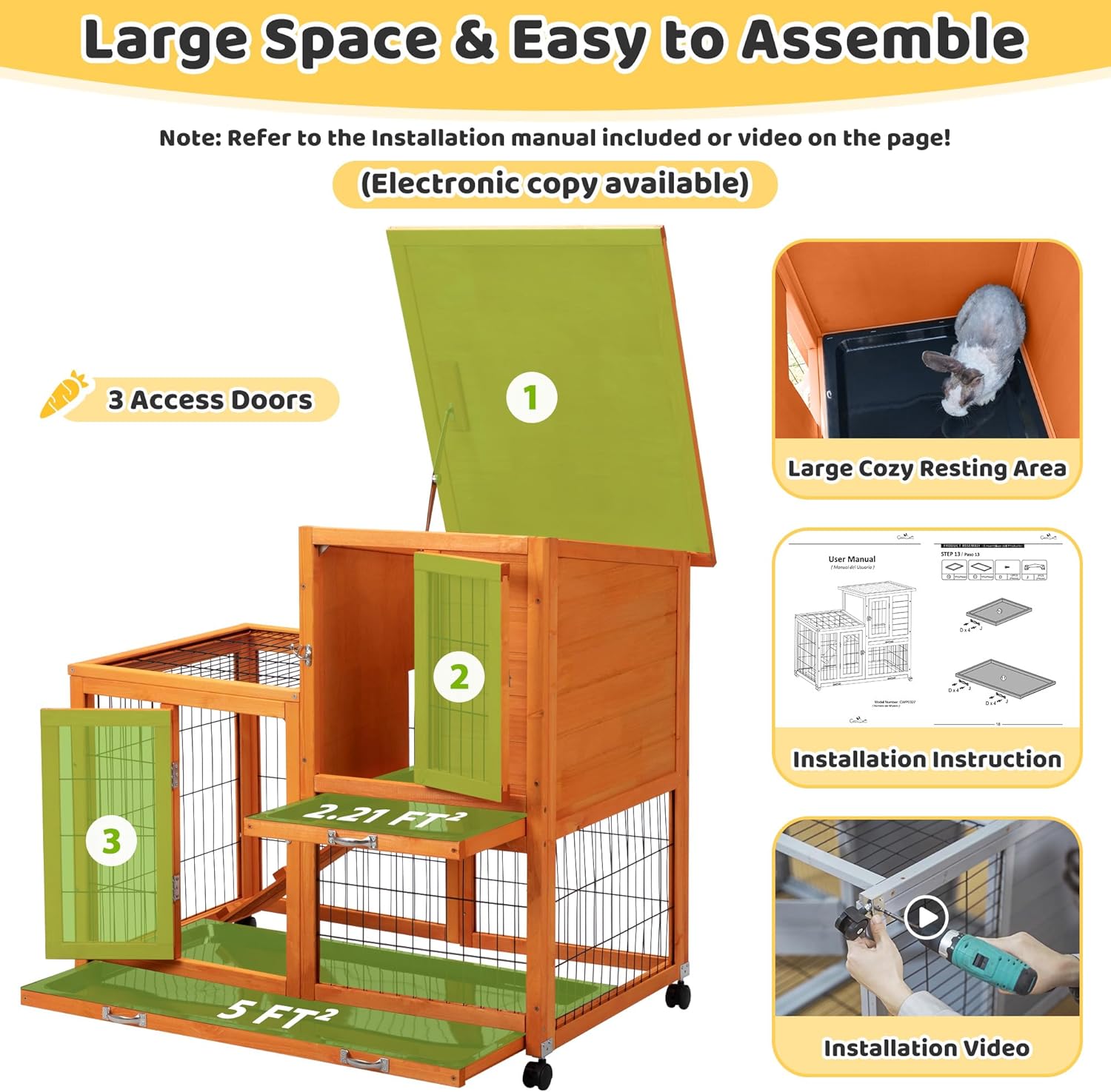 • 【5-Minute Maintenance】Removable 0.79" deep trays with raised edges prevent spills. 3 doors and 1 openable roof allow instant access or replacing pee pads, water, food, or groom your rabbits