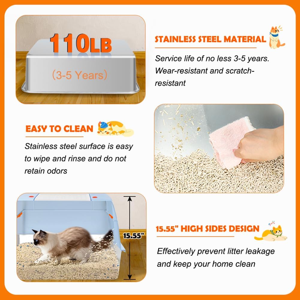• PREMIUM STAINLESS STEEL - Built with thickened stainless steel, this cat litter box is rust-resistant, scratch-proof, durable and long-lasting. It helps reduce odors more effectively than plastic alternativess, keeping the space fresh. The box holds up to 110 lbs and lasts 3-5 years, reducing the need for frequent replacements