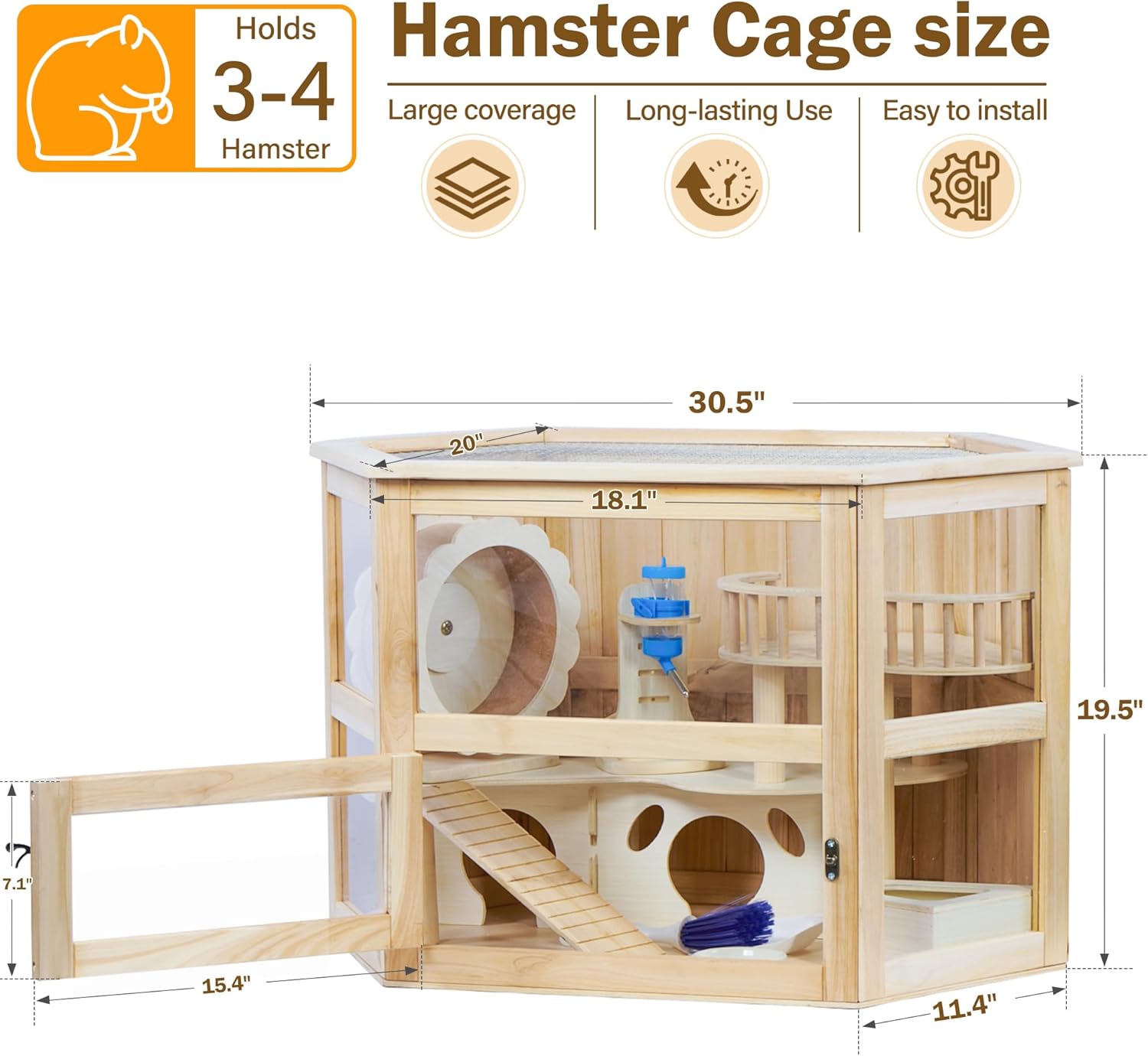 • Spacious Dimension:This large hamster cage features a 3-tier design,with extra large interactive space of this hamster cage wooden can comfortably accommodate thick bedding and a range of toys for your pets to burrow and explore;enabling you to create a well-suited habitat for your hamster