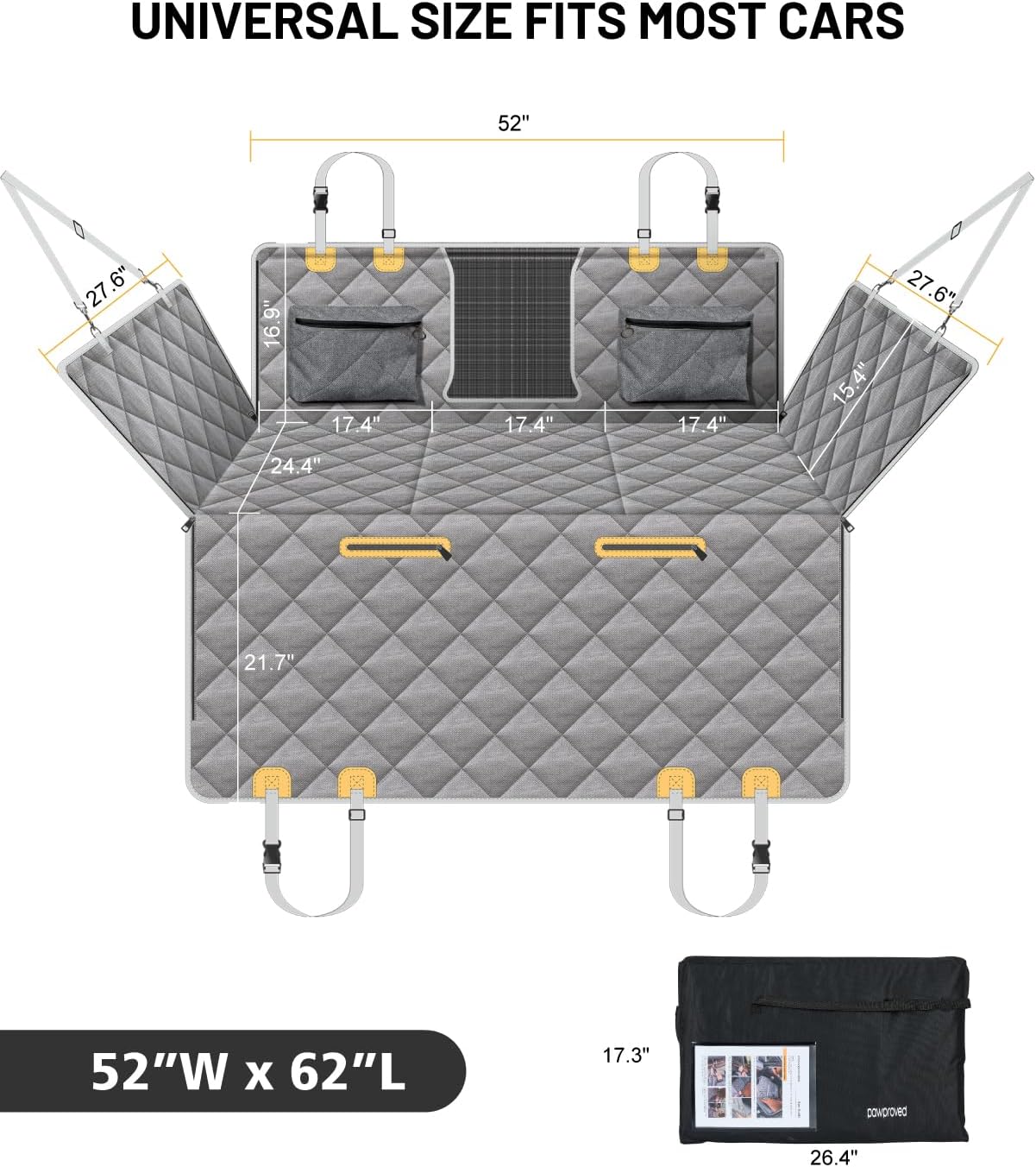 • Extended Activity Space: Our car hammock (52.3”W x 24.4”D) prevents footwell sliding, expands space by 40%, and ensures safety for movement and stretching to ease travel anxiety. Offers full rear-seat coverage, ideal for large breeds, older dogs, or multi-dog households.