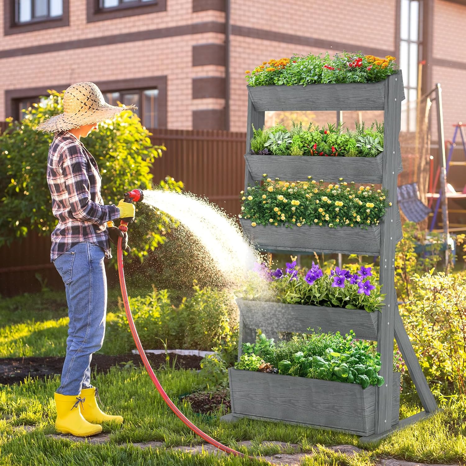 SUNYRISY 5 Tiers Vertical Raised Garden Bed Outdoor Planter Tower, Wooden Freestanding Planter Box for Planting Herbs Flowers Vegetables Backyard Patio Balcony Indoor Outdoor Gardening, Grey