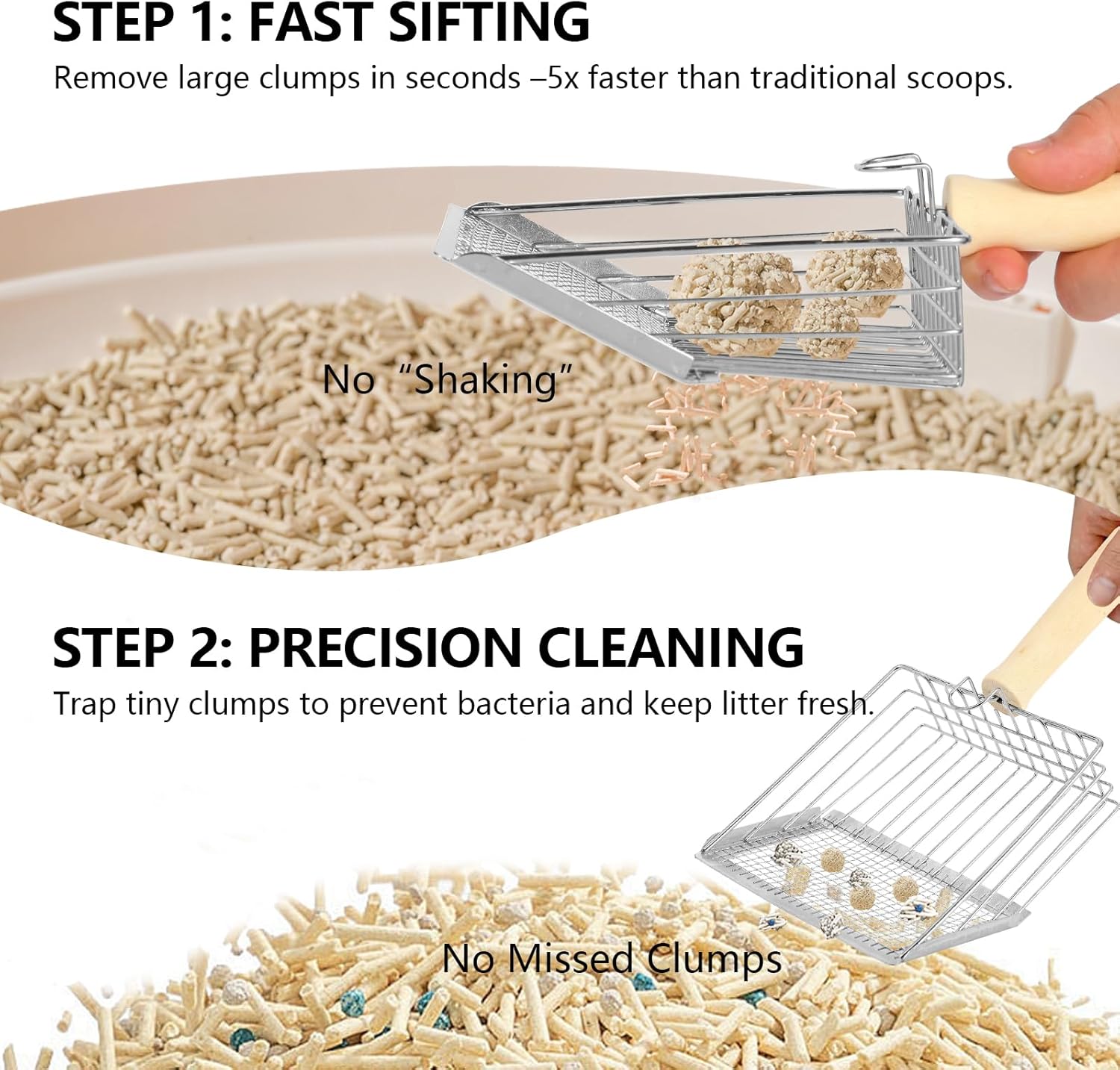 • ★ Comfortable & Ergonomic Design – The upgraded handle is now extra sturdy and won’t loosen over time. Made from solid wood and shaped for a natural grip, this stainless steel cat litter scoop follows ergonomic principles to reduce hand strain, making scooping easier and more comfortable