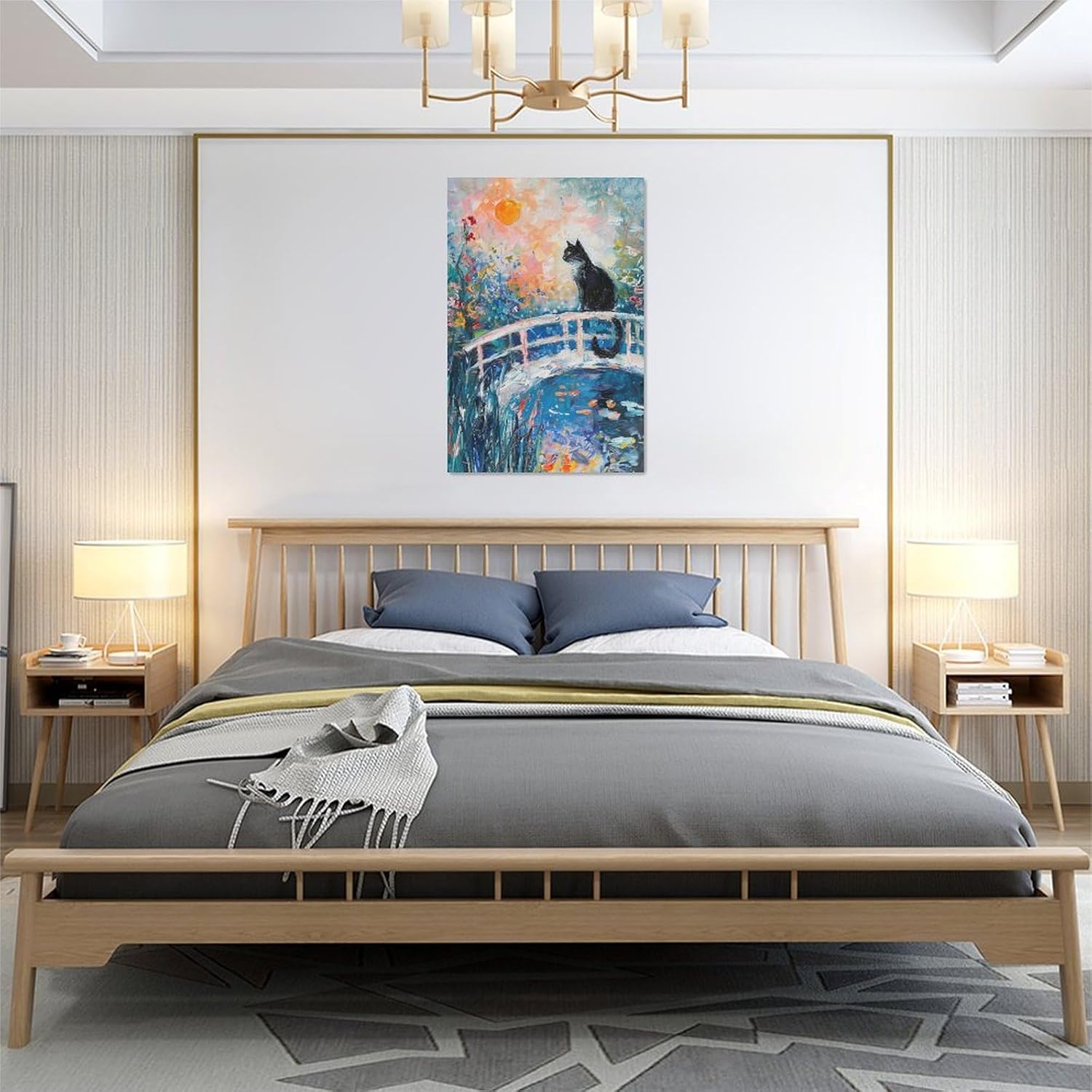 Quorin Black Cat Wall Art Water Lily Sunset Pictures Cat Wall Decor Impressionism Canvas Print Painting Artwork for Bathroom Living Room Bedroom 16"x24"