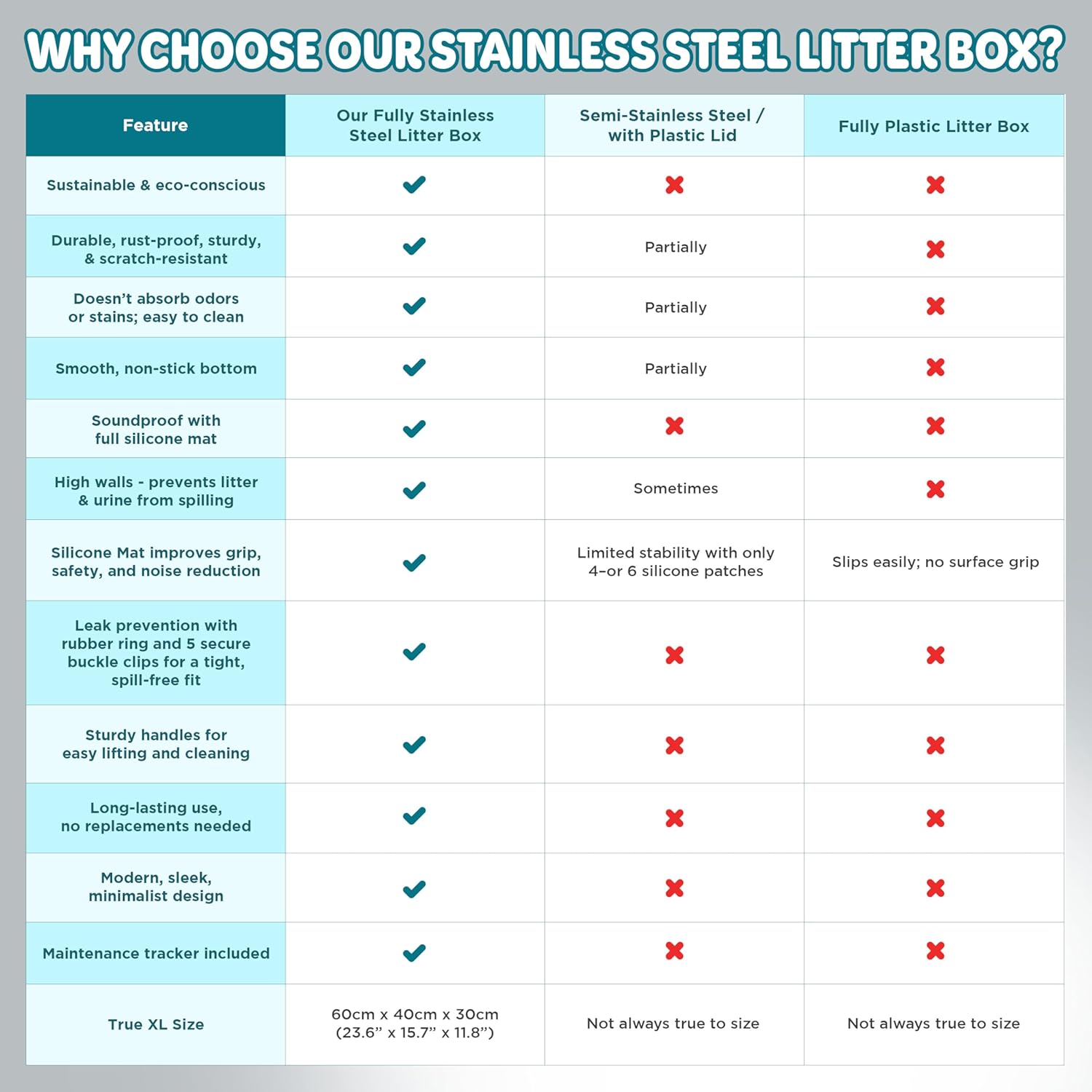 • Quiet & Stable –Unlike other stainless steel litter boxes, this stainless steel enclosed litter box features a full silicone mat underneath, absorbing noise and vibrations to reduce loud scratching sounds. The non-slip, pet-safe silicone base keeps the steel cat litter box firmly in place, ensuring stability and a peaceful experience for both you and your cat.