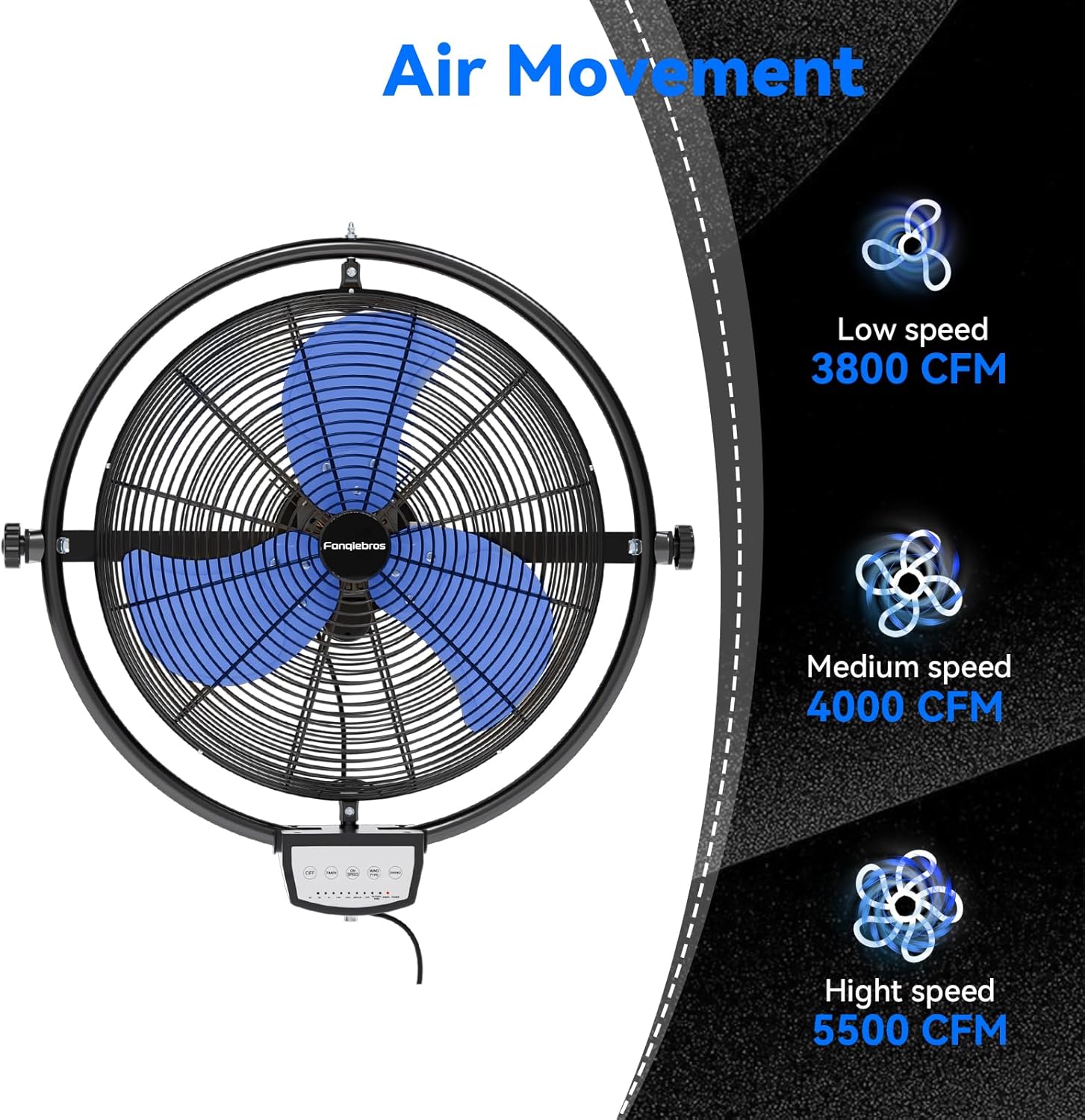 - 𝐇𝐢𝐠𝐡 𝐕𝐞𝐥𝐨𝐜𝐢𝐭𝐲 𝐀𝐢𝐫 𝐅𝐥𝐨𝐰 - The heavy duty wall fan design makes the operation more intuitive and simple, and the high, medium and low speeds can be adjusted by the remote control to meet different needs. High speed 5500 CFM, medium speed 4000 CFM, low speed 3800 CFM, providing hurricane-like airflow to meet your garages, shops or outdoor use(Note: used on a covered patios or porch, BUT NOT EXPOSED TO RAIN)