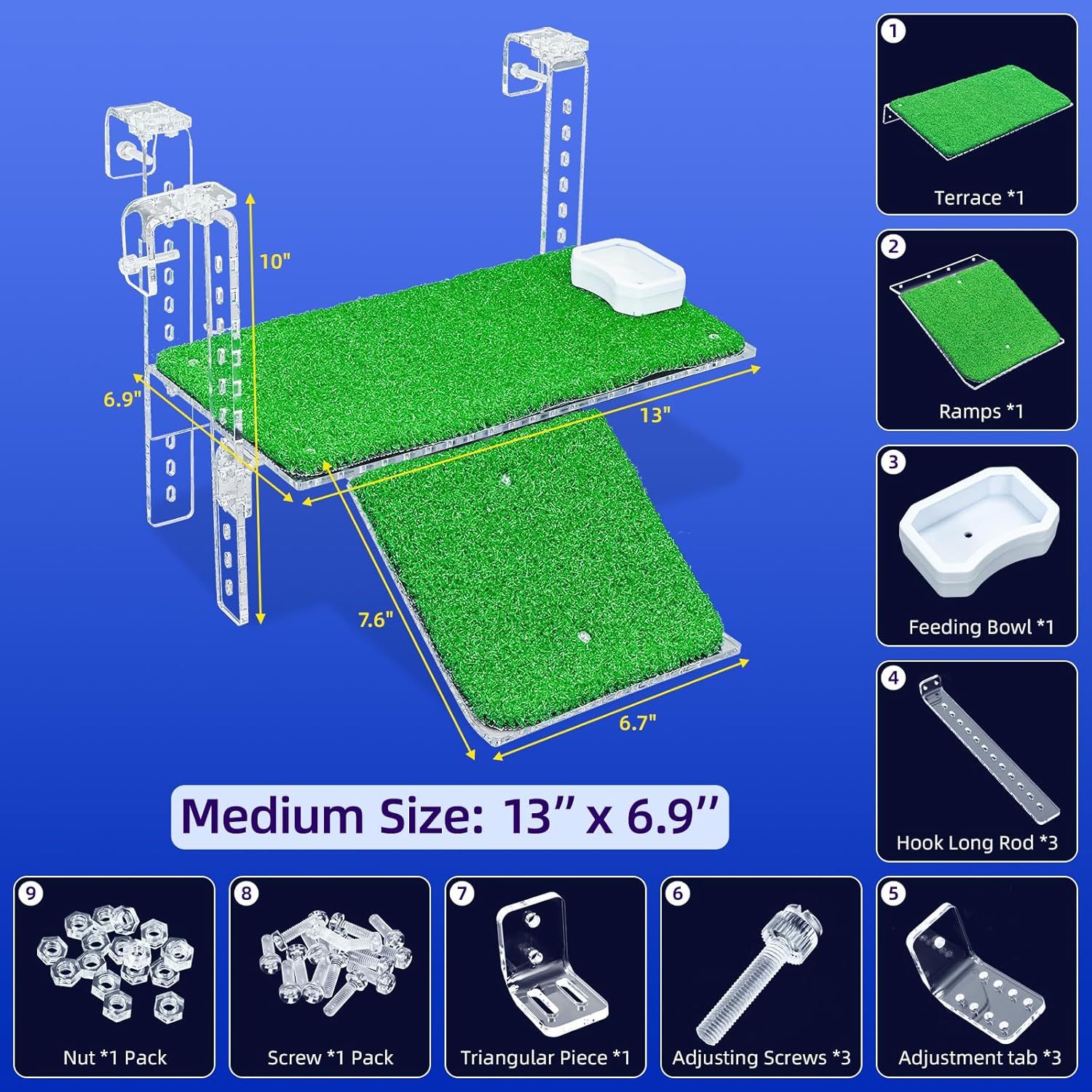 • 【Crystal Clear, Sturdy, and Aesthetic】Made from high-quality transparent acrylic, this turtle basking platform is not only sturdy but also visually appealing. Its sturdy construction ensures long-lasting use, while the removable artificial grass surface makes cleaning easy. It’s the perfect addition to any turtle tank or turtle dock.