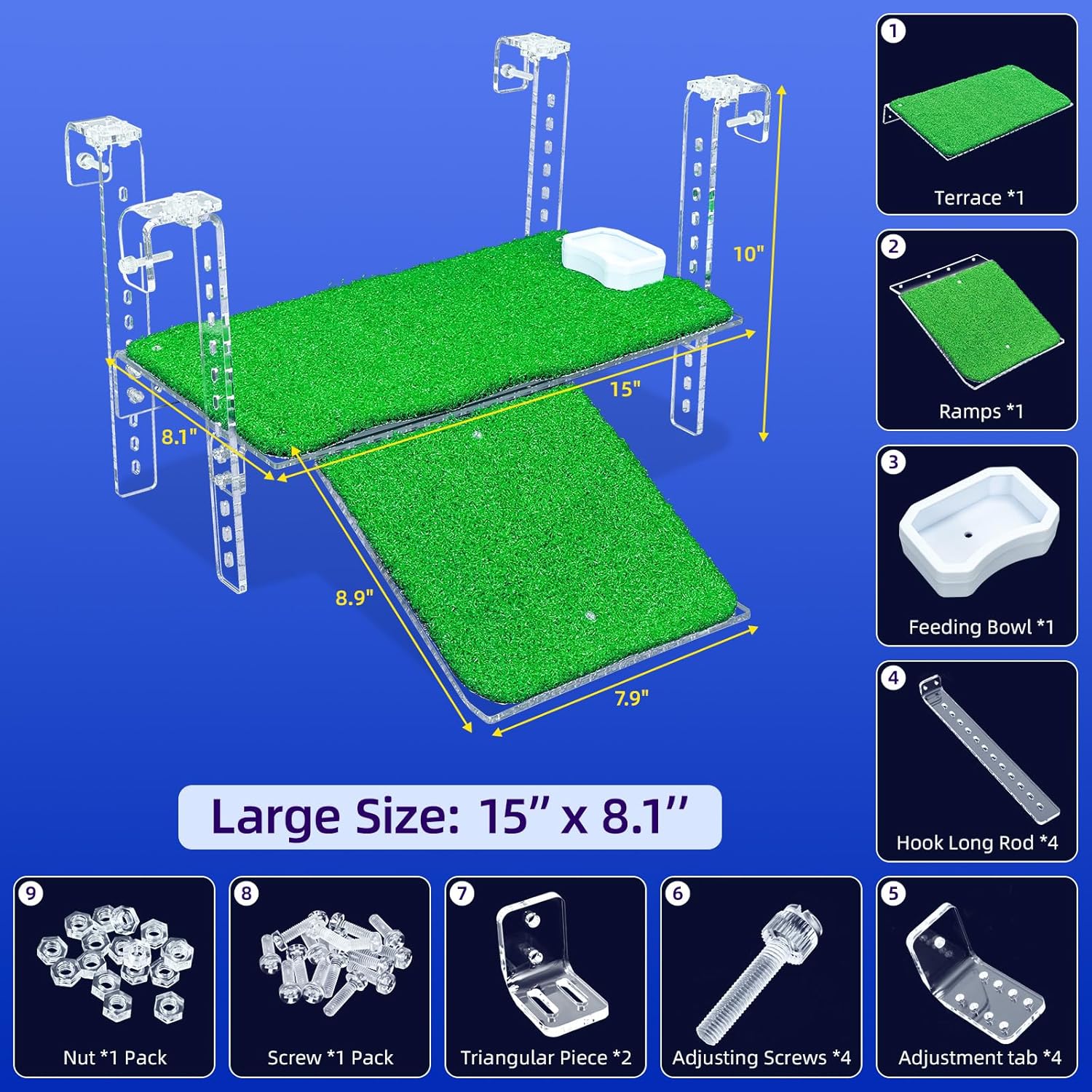 • 【Crystal Clear, Sturdy, and Aesthetic】Made from high-quality transparent acrylic, this turtle basking platform is not only sturdy but also visually appealing. Its sturdy construction ensures long-lasting use, while the removable artificial grass surface makes cleaning easy. It’s the perfect addition to any turtle tank or turtle dock.