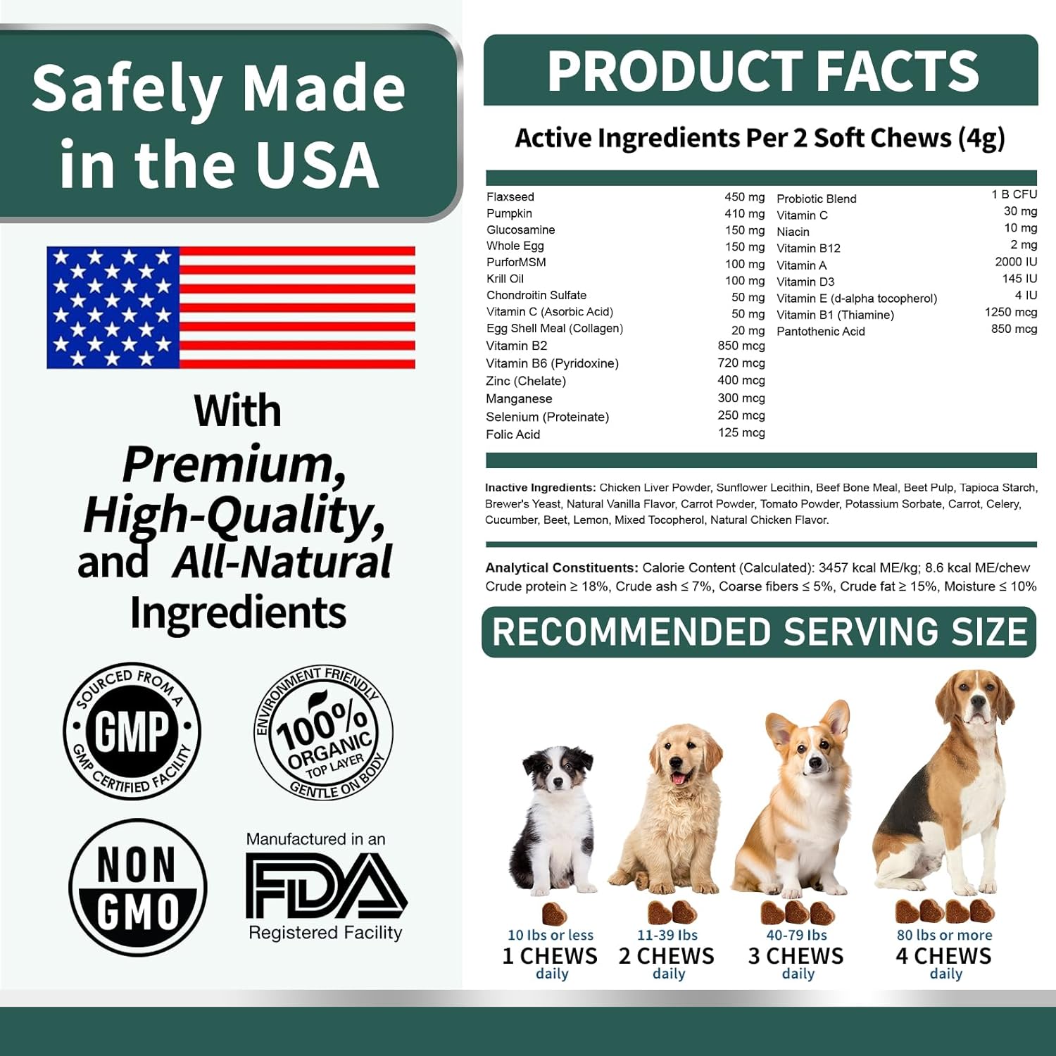 • Nourishes Skin & Coat with Omegas – Enriched with eggshell meal and krill oil omegas, these chews provide the nutrients needed to soothe dry, itchy skin and promote a stronger, shinier coat. Your dog will look and feel healthier from head to tail.