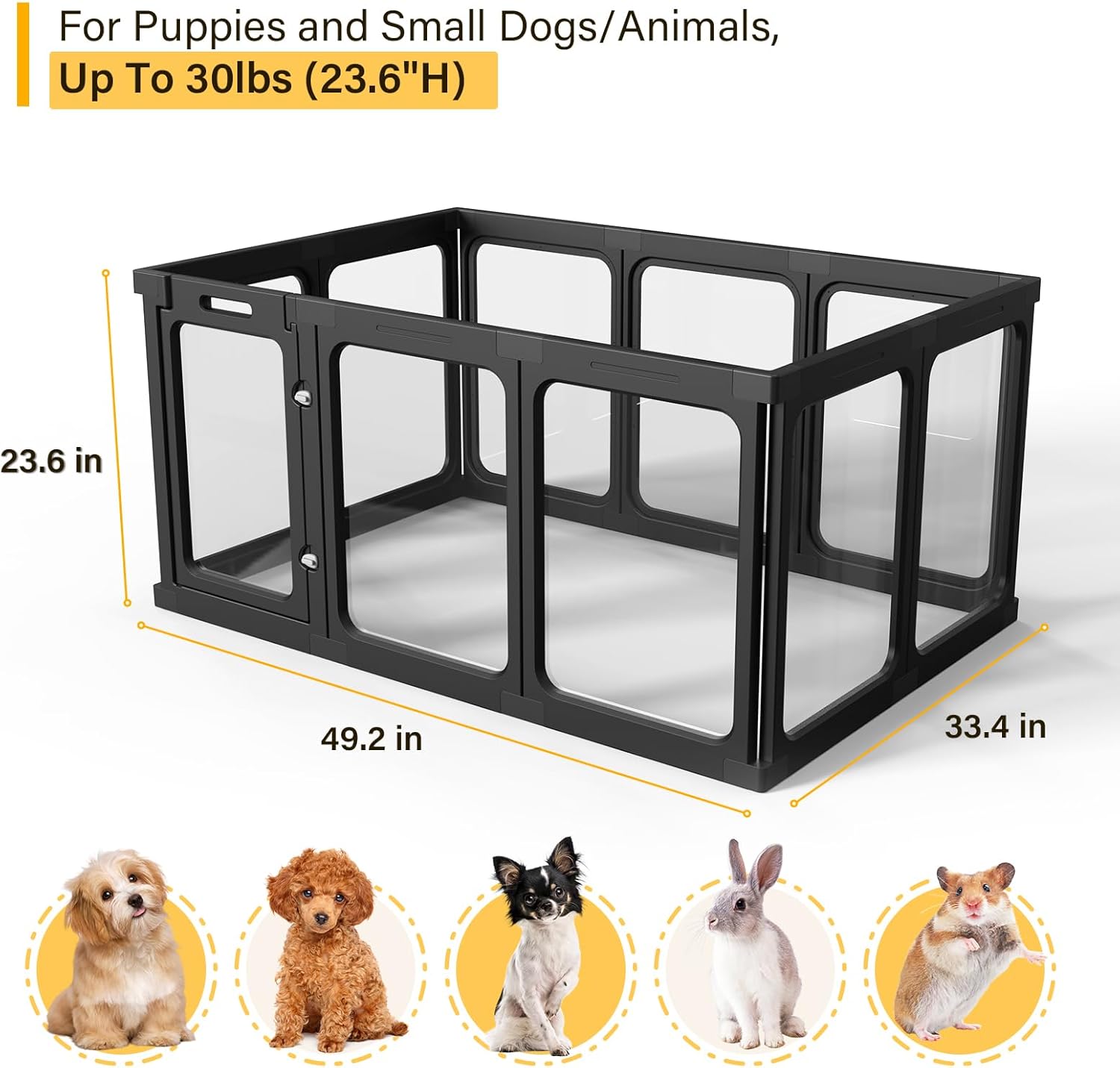 • 【Spacious Design】With dimensions of 33.4in L x 49.2in W x 23.6in H and 10 panels, this clear dog play pen provides ample space for your pets to move around comfortably. The spacious design ensures they have plenty of room to play and explore.