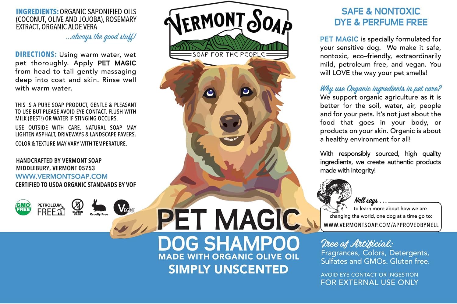 VERMONT SOAP Organics Pet Shampoo - Infused with Organic & Natural Olive Oil, Coconut & Aloe Vera Dog Shampoo for Sensitive Skin - USDA Certified Grooming - Unscented (640oz)