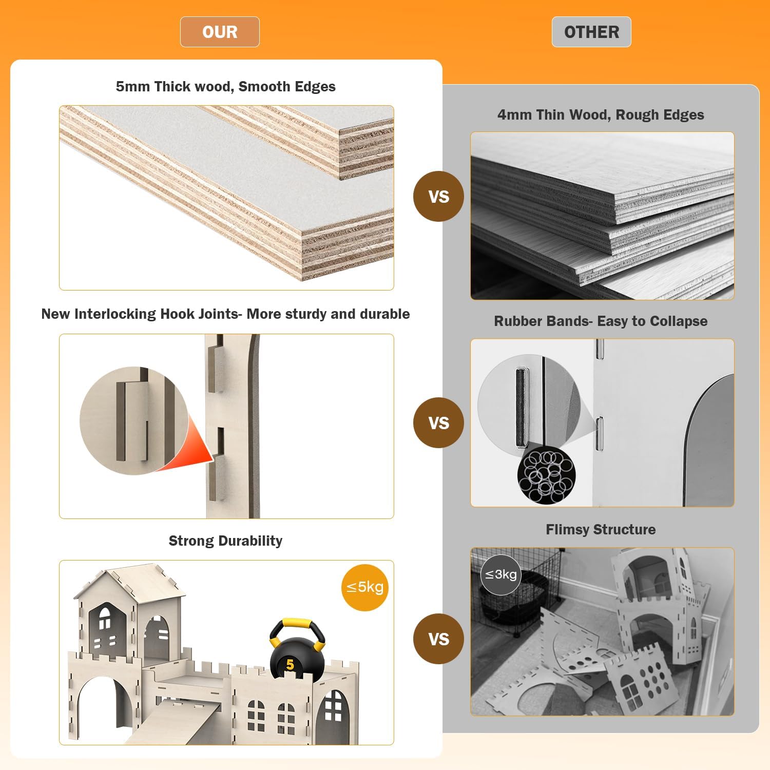 • 【Rubber-Band-Free Setup for Nervous Chewers】:Say goodbye to dangerous rubber bands! Our rabbit houses and hideouts feature new lnterlocking Hook Joint that secure panels tightly without hazardous parts – a critical upgrade praised by rabbit rescue groups.