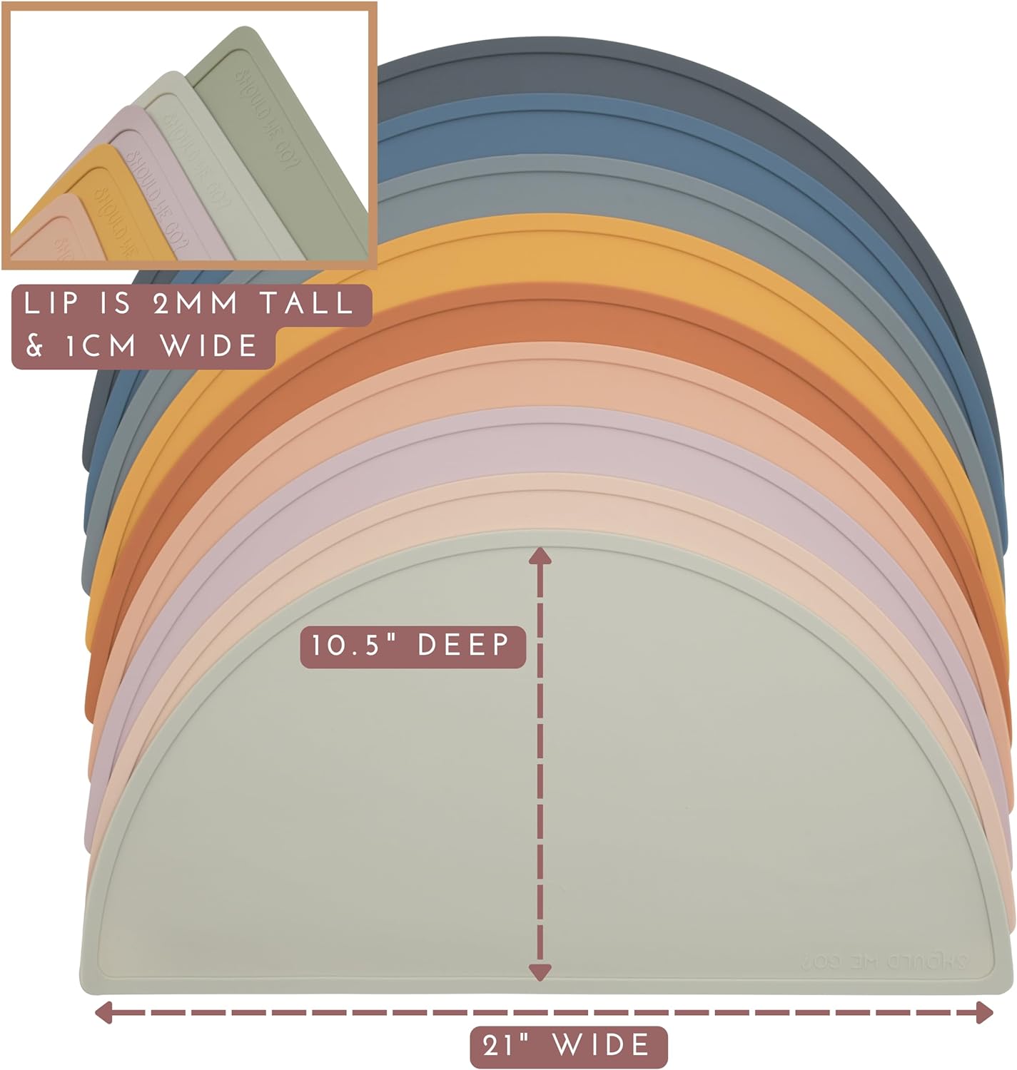• CONTROL SPILLS AND MESSES: Our silicone pet food mat with a raised edge helps keep spills and messes on the mat. The medium size mat is 21" across x 10.5" deep. It works with bowls that are 7.5" across or smaller. The lip is .2" tall and .4" wide.