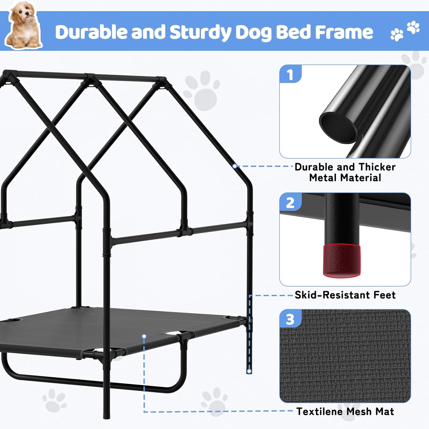 • 【Durable and Versatile Design】Crafted from heavy-duty, powder-coated steel, the reinforced frame and elevated dog bed deliver great load-bearing strength and rock-solid stability, ensuring excellent support for even larger breeds.