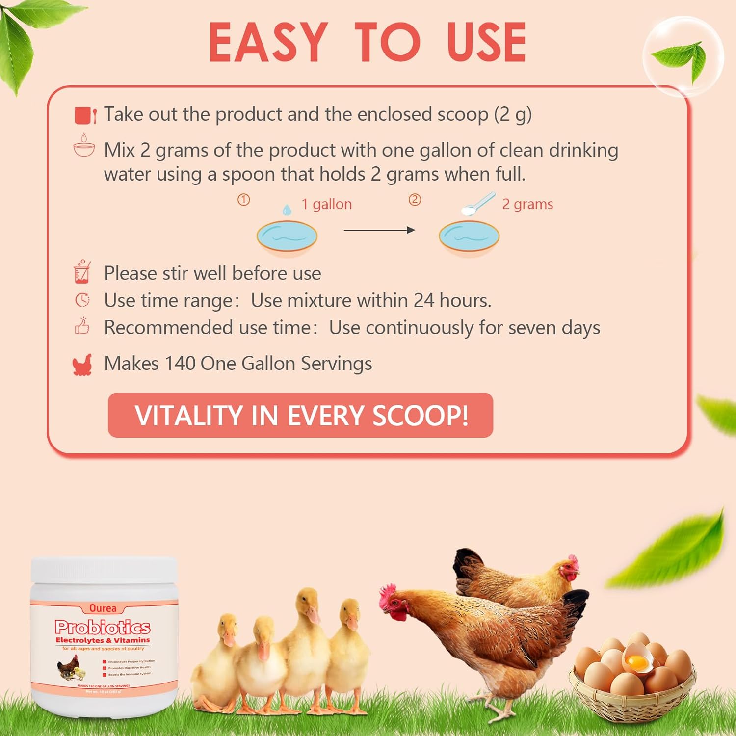 • Boost Immunity & Stress Resistance: In the face of environmental changes and disease risks, every chicken needs protection. Ourea formula is rich in essential vitamins A, D, E, and C, probiotics, and poultry electrolytes to strengthen the immune system, help poultry fight off illnesses, and adapt to stress, keeping your flock strong and full of vitality