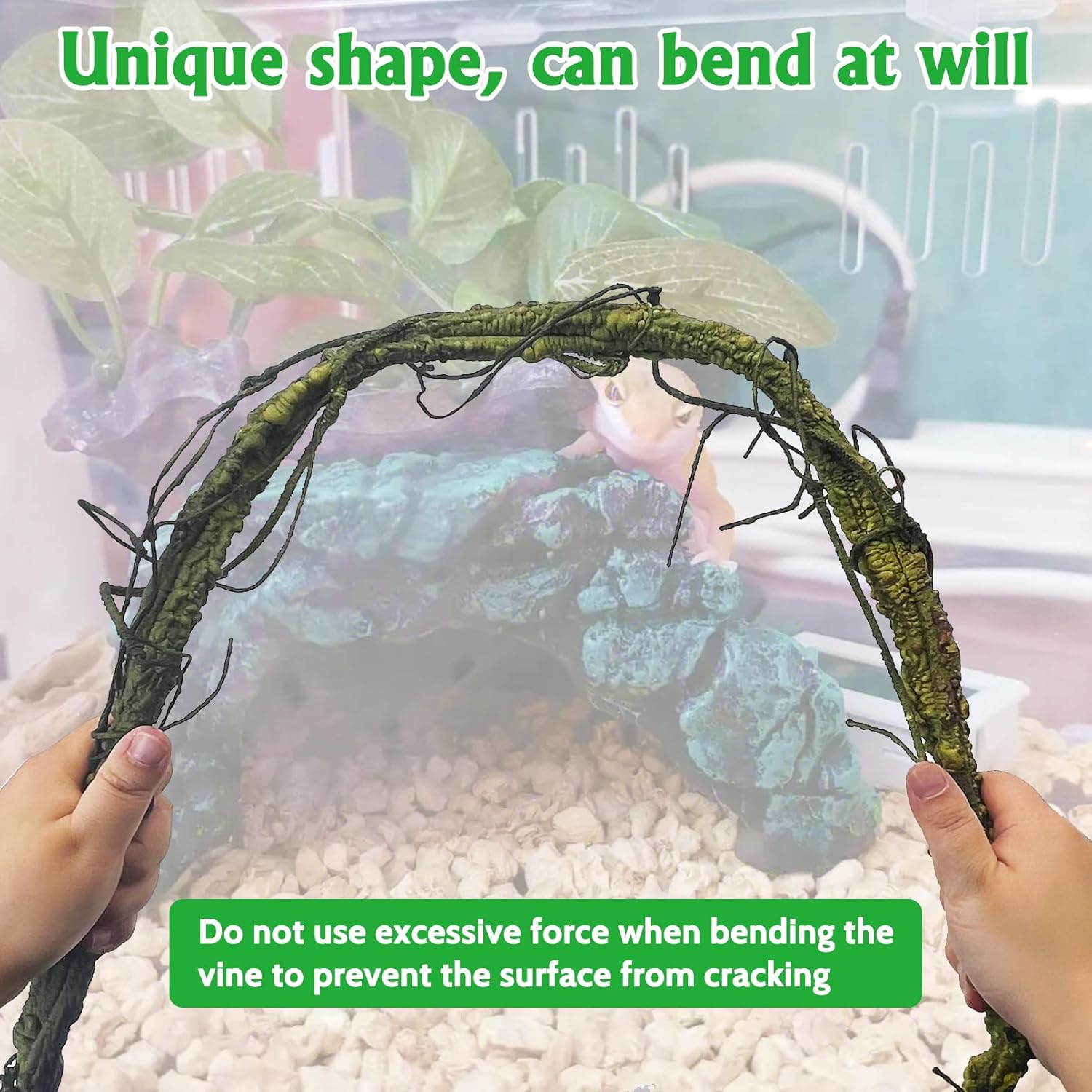 • Assembly & Use: Please use it in a large tank, at least 40 gallon, put in a tall terrarium better. Don't push too hard when bending the vine. The green leaves need to be washed before use