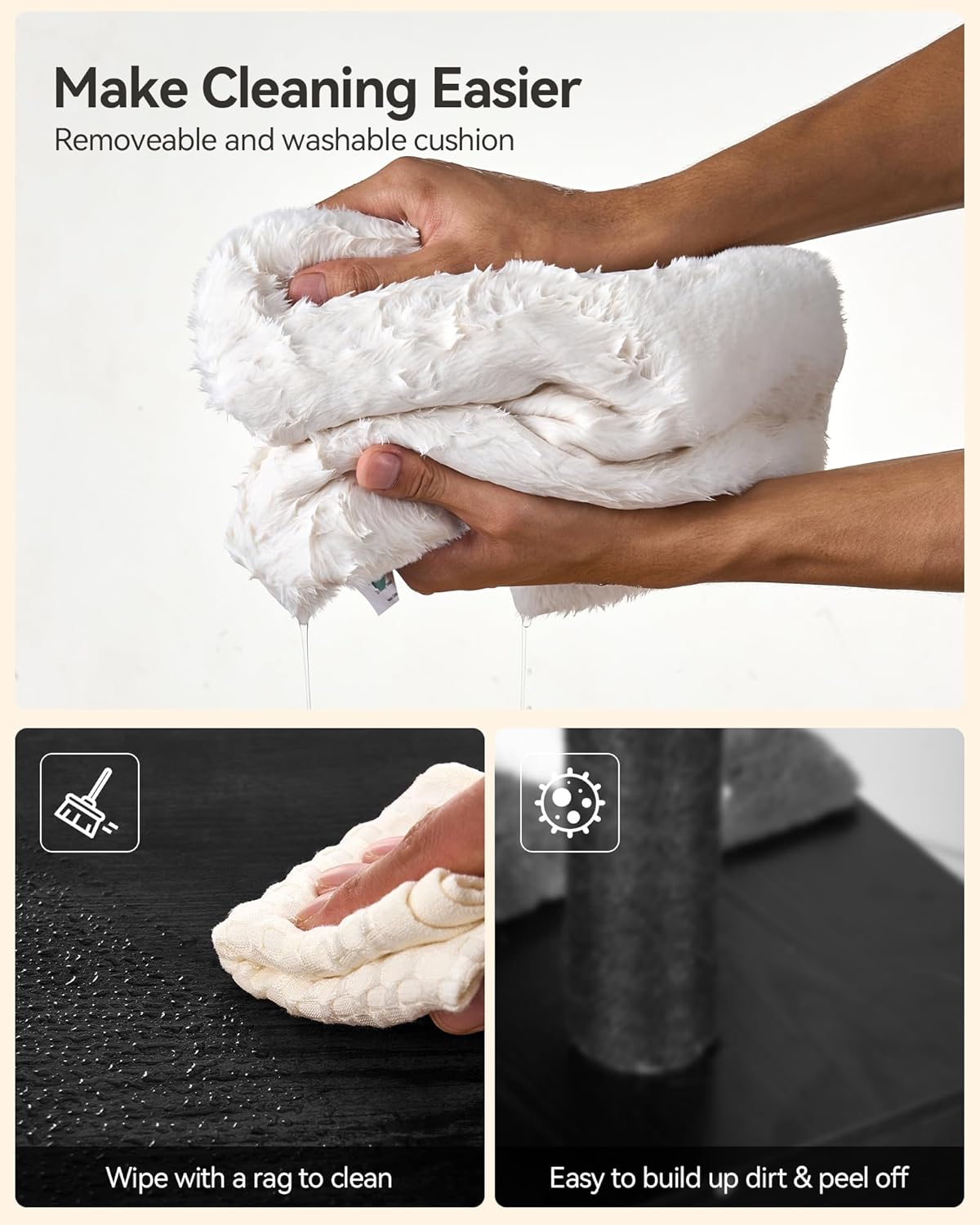 • DURABLE AND EASY TO CLEAN DESIGN : This cat tree for big cats is designed with a scrubbable board veneer platform, which is stain-resistant and dirt-resistant and can be wiped clean in one wipe; with removable washable cushions, hygiene and maintenance are easier. The sisal winding post and massage brush design fully satisfy the cat's nature of claw grinding and itching