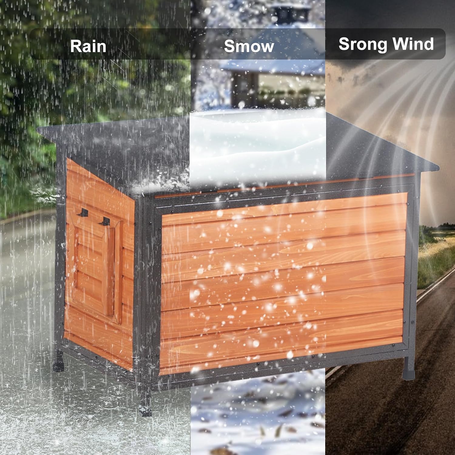 • Weatherproof & Durable Build: Designed for year-round outdoor use, this dog house outdoor combines a UV-resistant asphalt roof with thick, interlocked cedar-plywood-foam panels. The sloped roof and elevated base prevent water pooling, while sealed joints and a water-repellent coating shield against rain, snow, and humidity