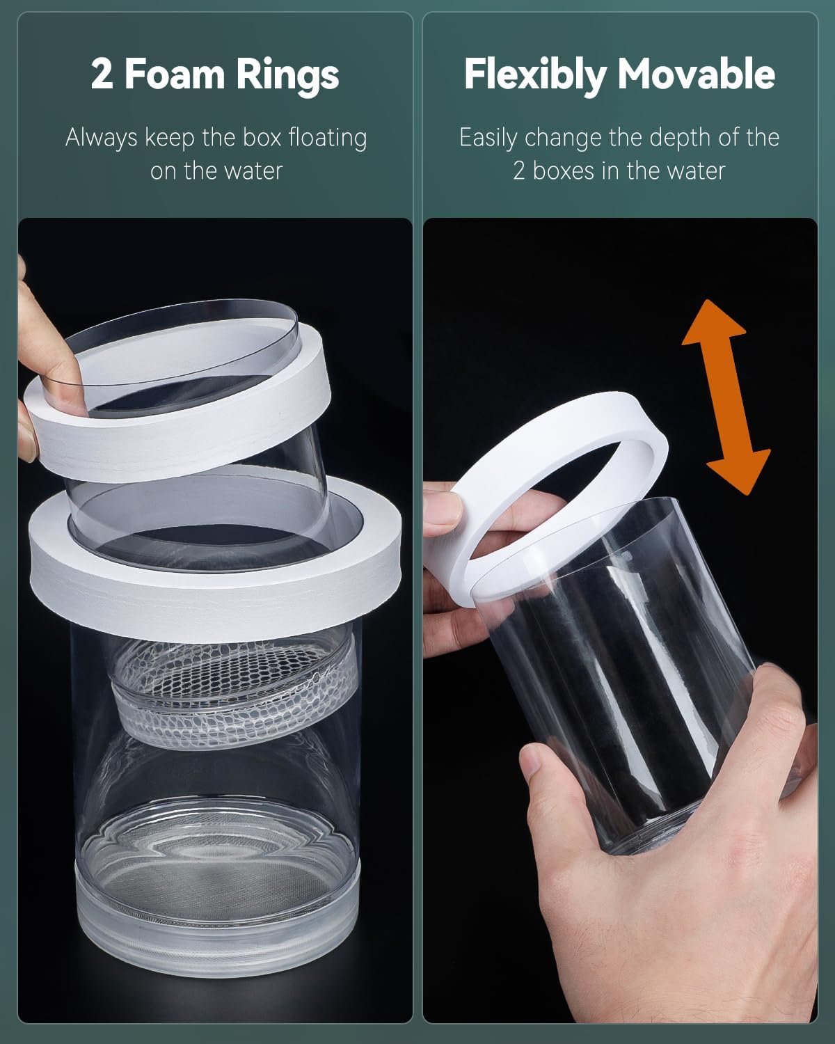 • Floating Design: No suction cups required! 2 foam rings with negligible weight easily keep the plastic isolation box floating on the water at all times. And the depth of the 2 boxes in the water can be changed at will by moving the foam rings up and down