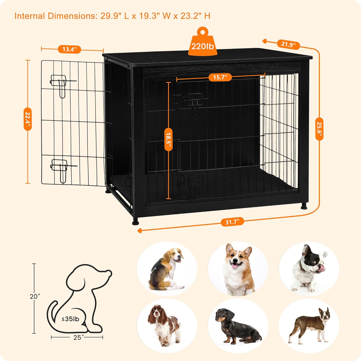 DWANTON Dog Crate Furniture with Cushion, Wooden Kennel Table with Double Doors, Indoor Dog House, Medium Size, 32.5" L, Black