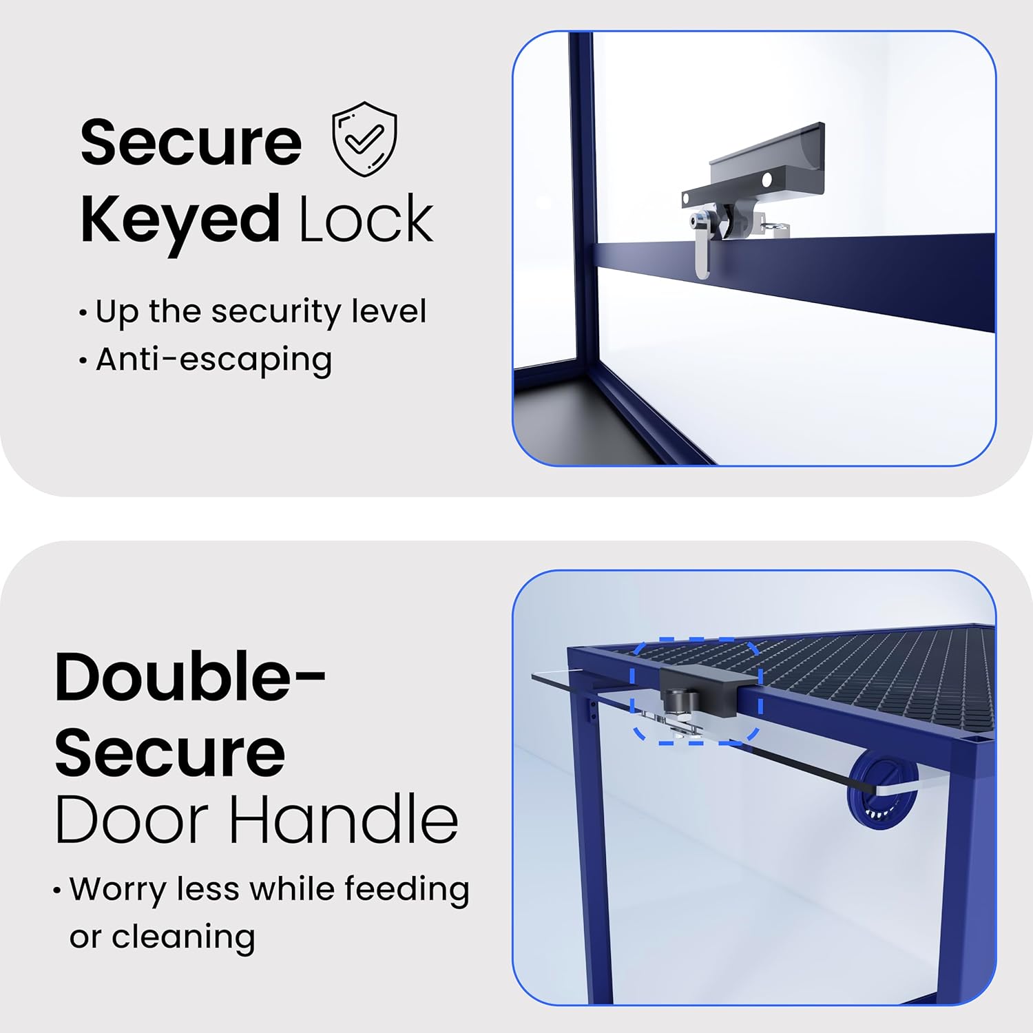 • ใ€Lock Includedใ€‘A tempered glass door with a safety keyed lock to prevent escape and accidental opening by others. NO GAPS FOR ESCAPING with fully closed structure. Rigid tempered glass doors for extra safety.