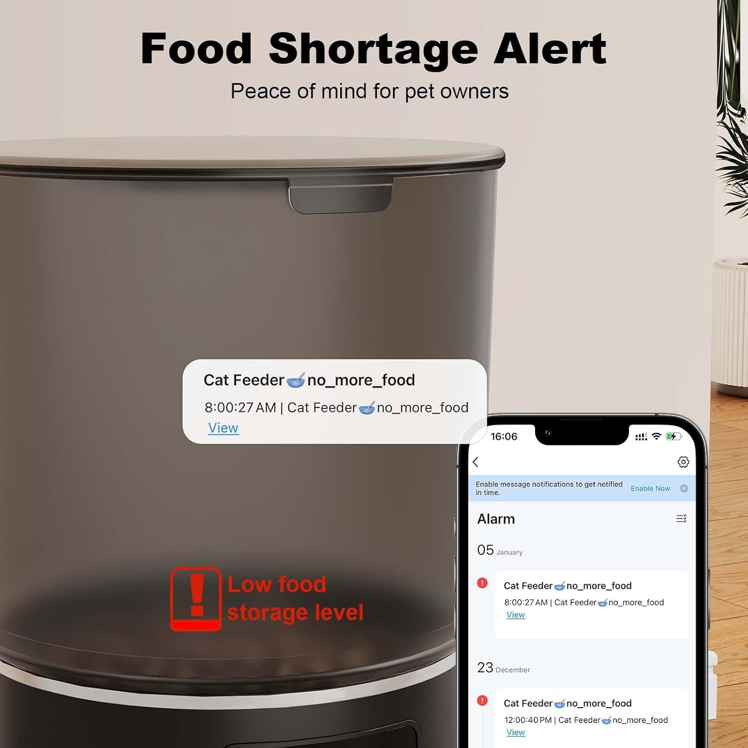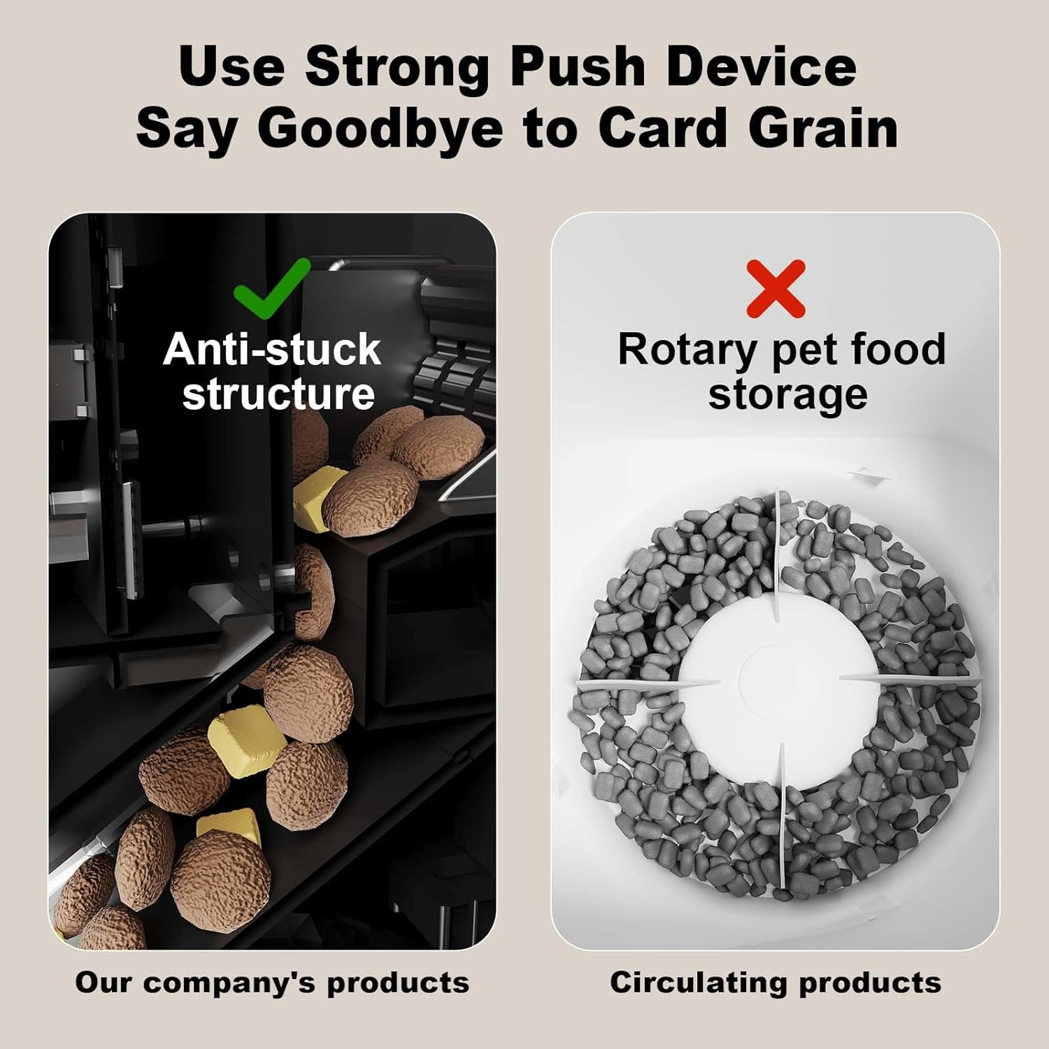 • [Dual Power & Smart Alerts] "USB/battery (battery not included) dual-mode power ensures 24/7 reliable operation. Infrared sensors automatically detect food jams/low levels and send instant app alerts. Compatible with 2-15mm dry kibble (not suitable for wet food).