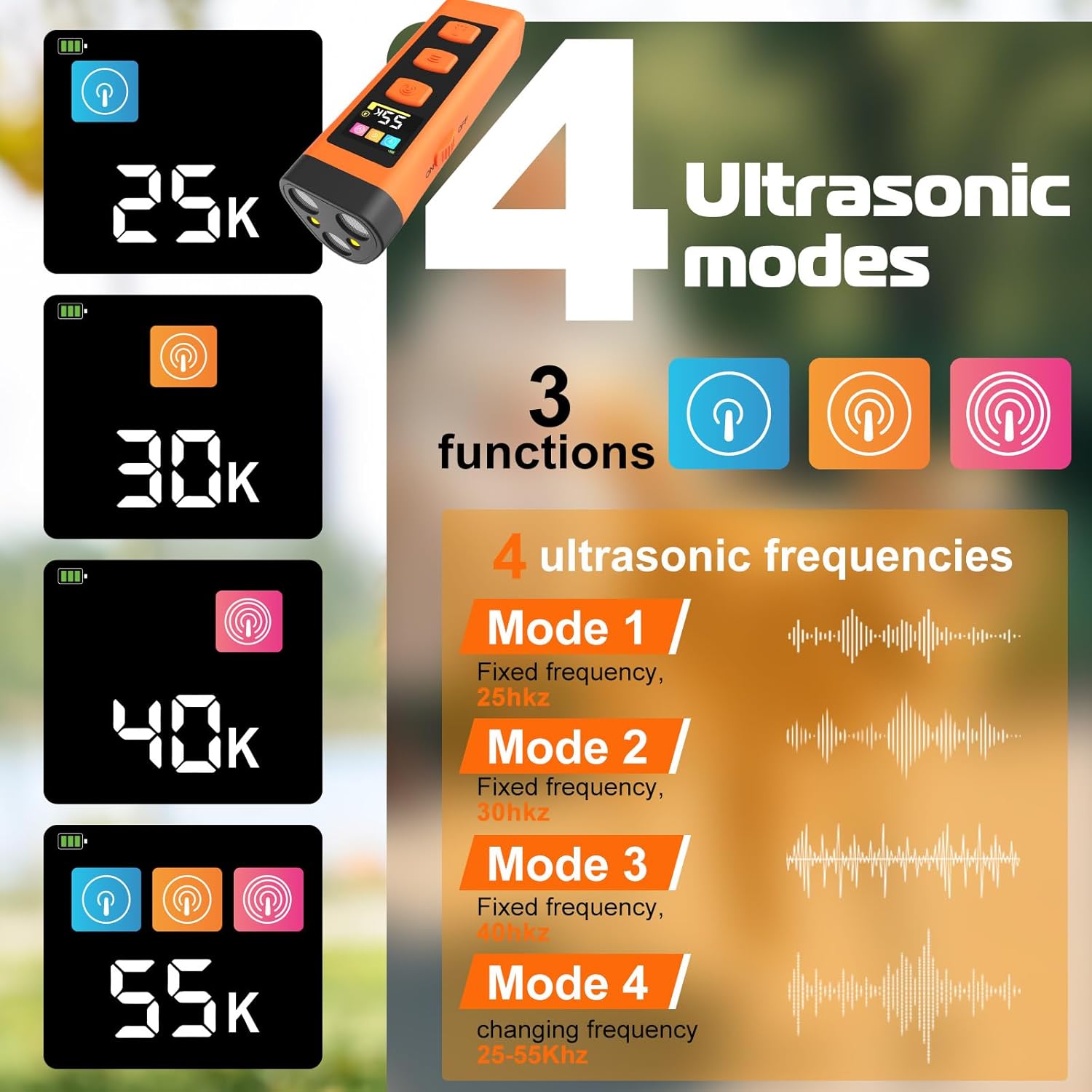 • 【Smart Triple-Mode Adjustable System】:Featuring LED light, ultrasonic, and sound modes, this device offers customizable training with 4 ultrasonic intensity levels and 5 sound frequencies (25kHz-55kHz). The clear LED display shows active modes and battery status for easy use, while the 8-second auto-stop ensures safe, controlled sessions every time.