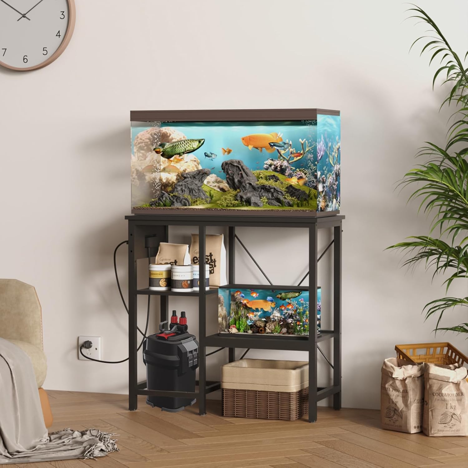 20-29 Gallon Fish Tank Stand with Power Outlet & LED Light, Metal Aquarium Stand with 3 Tier Adjustable Storage Shelves, Tank Stand for Reptile Tank, Turtle Tank, 30.7" L*13.8" W, Black
