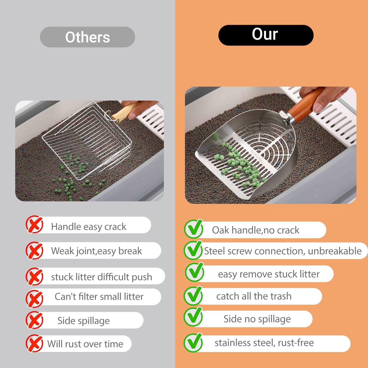 • [Long Oak Handle – Comfortable and Reliable Grip] The oak handle has been extended from 12.5cm to 15.5cm for improved comfort and reach. It’s securely fastened with metal screws to ensure long-term stability. This long handle cat litter scoop won’t loosen or break—ideal for daily use. Say goodbye to flimsy cat scooper handles that fail when you need them most.