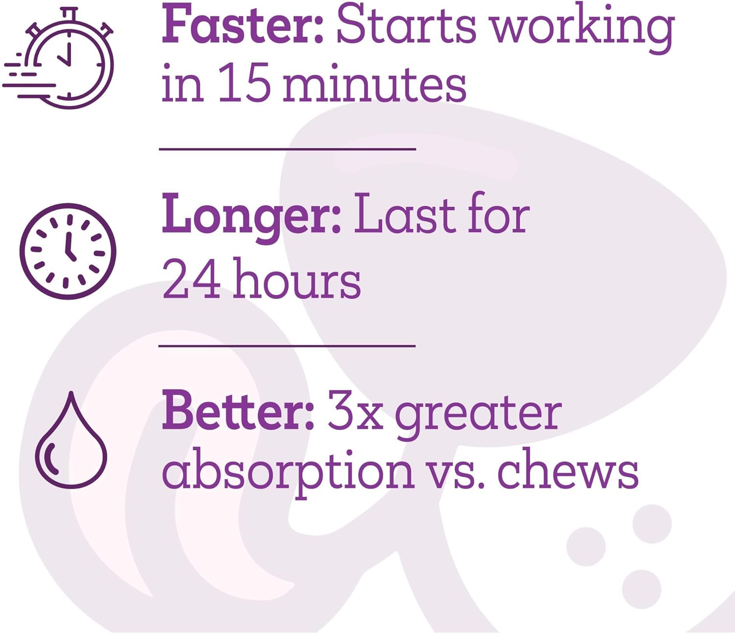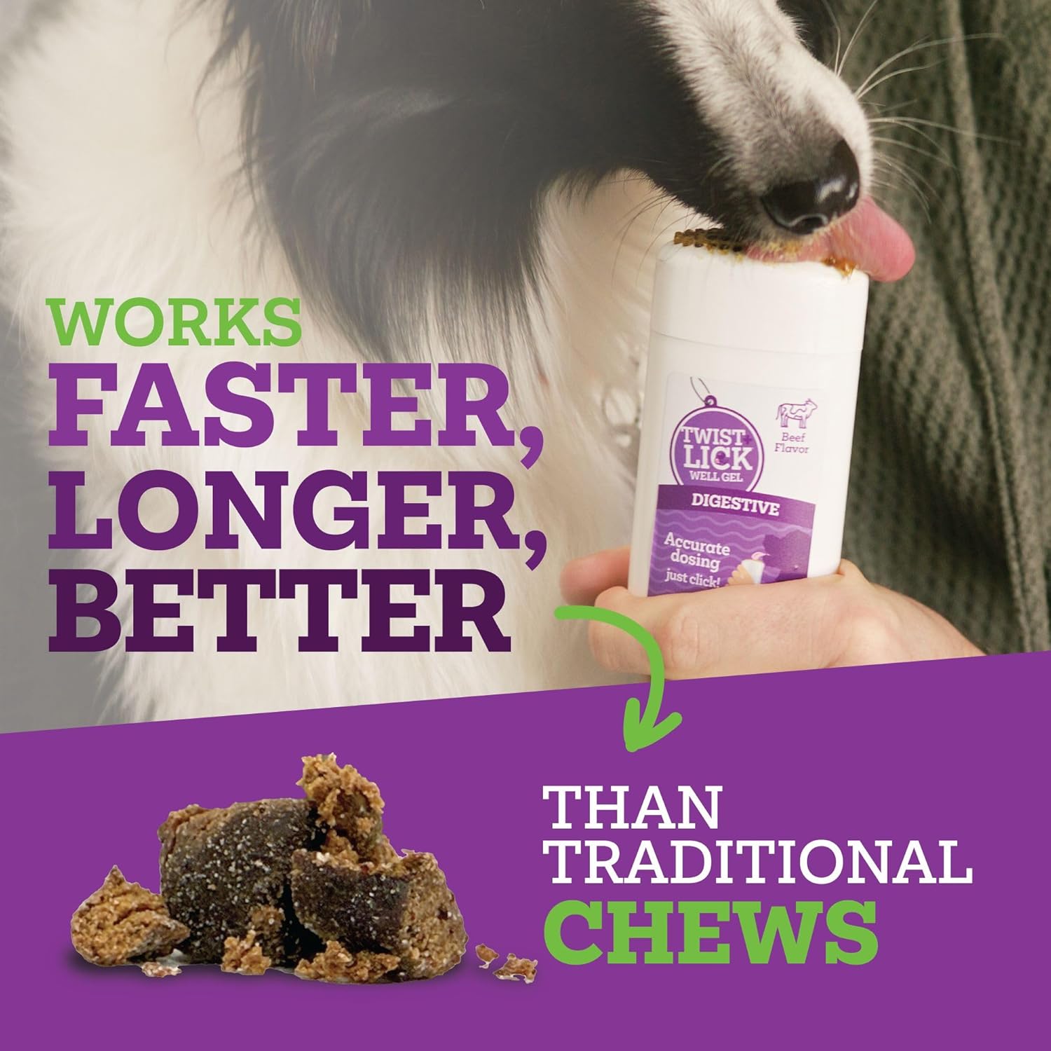 • Twist + Lick Digestive works fast by adhering to mucosal lining and releasing active ingredients into the bloodstream right away. That’s a fancy way of saying it sticks around in the mouth instead of going right to the digestive system. So, your pup gets the hip and joint relief it needs lightning fast.