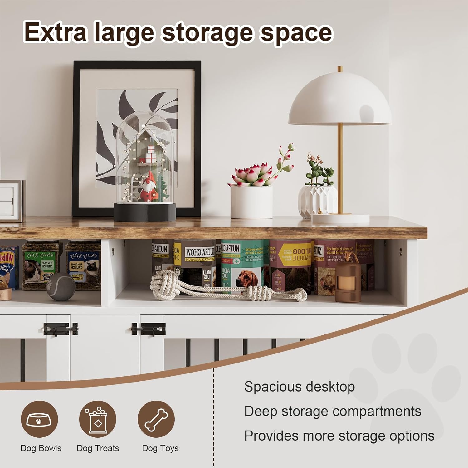 • [Storage Shelf Design] This large dog crate furniture seamlessly fits various home decors. Its wide desktop and open storage shelves easily organize your pup's treats and toys, keeping pet items tidy