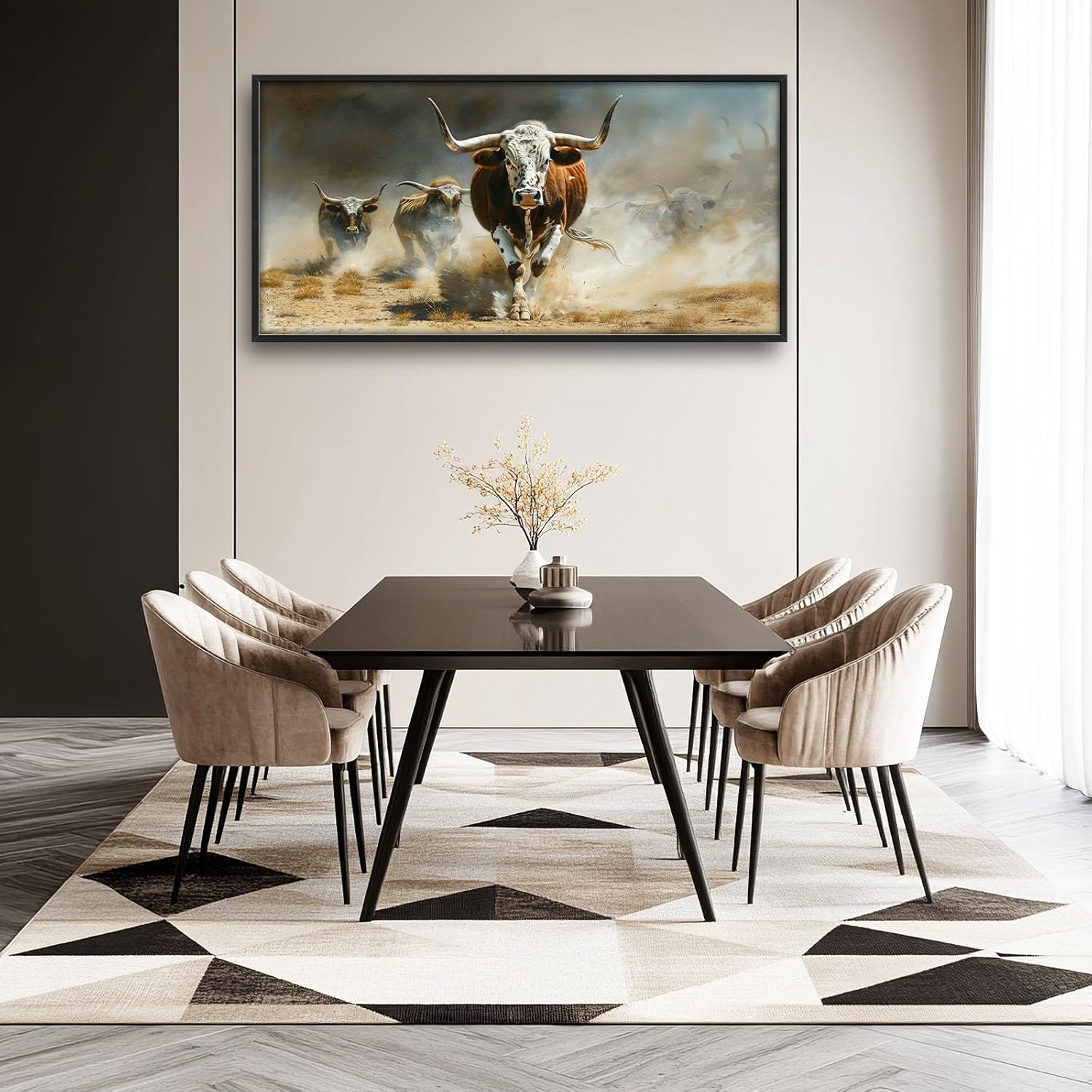 • 【Unique Design】An oil painting of longhorn cattle running through a dusty landscape, realistic and cinematic in style.