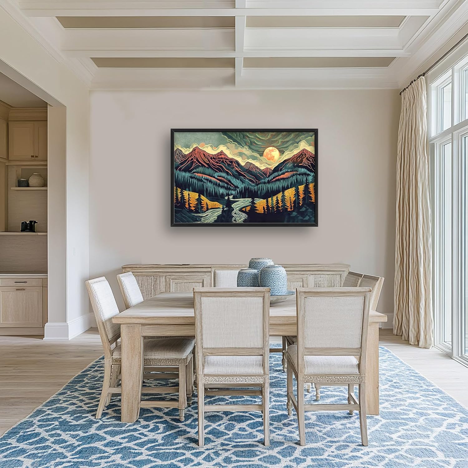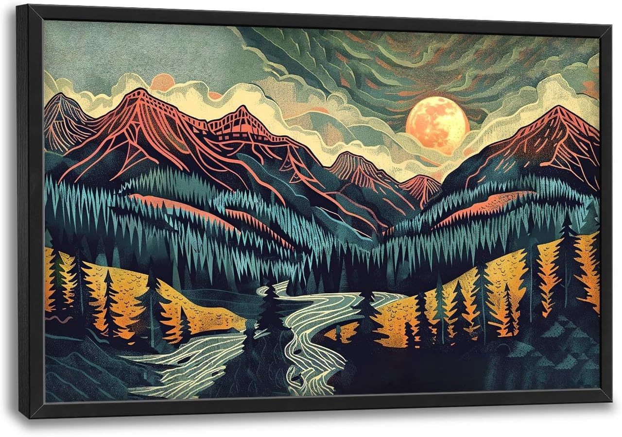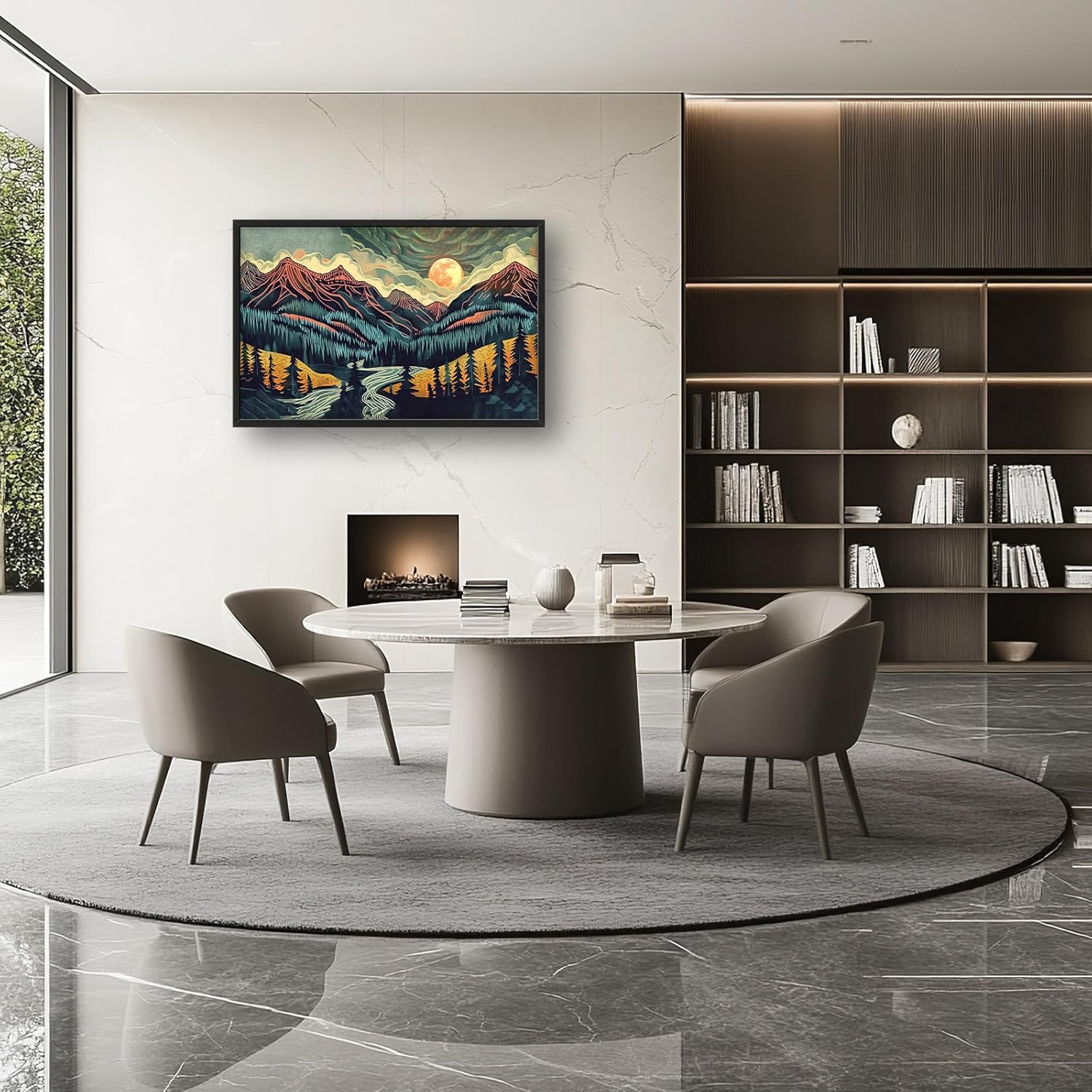• 【Unique Design】A vintage-style illustrations of the Rocky Mountains, with pine trees and rivers flowing through them in the colors of the full moon. Mountains should be rendered in rugged detail against an atmospheric sky full of clouds. A river snakes between two rows of evergreen trees, adding depth to the scene. The emphasis in this work is on bold lines and flat face blocks. It has retro futuristic elements that give it an otherworldly character.