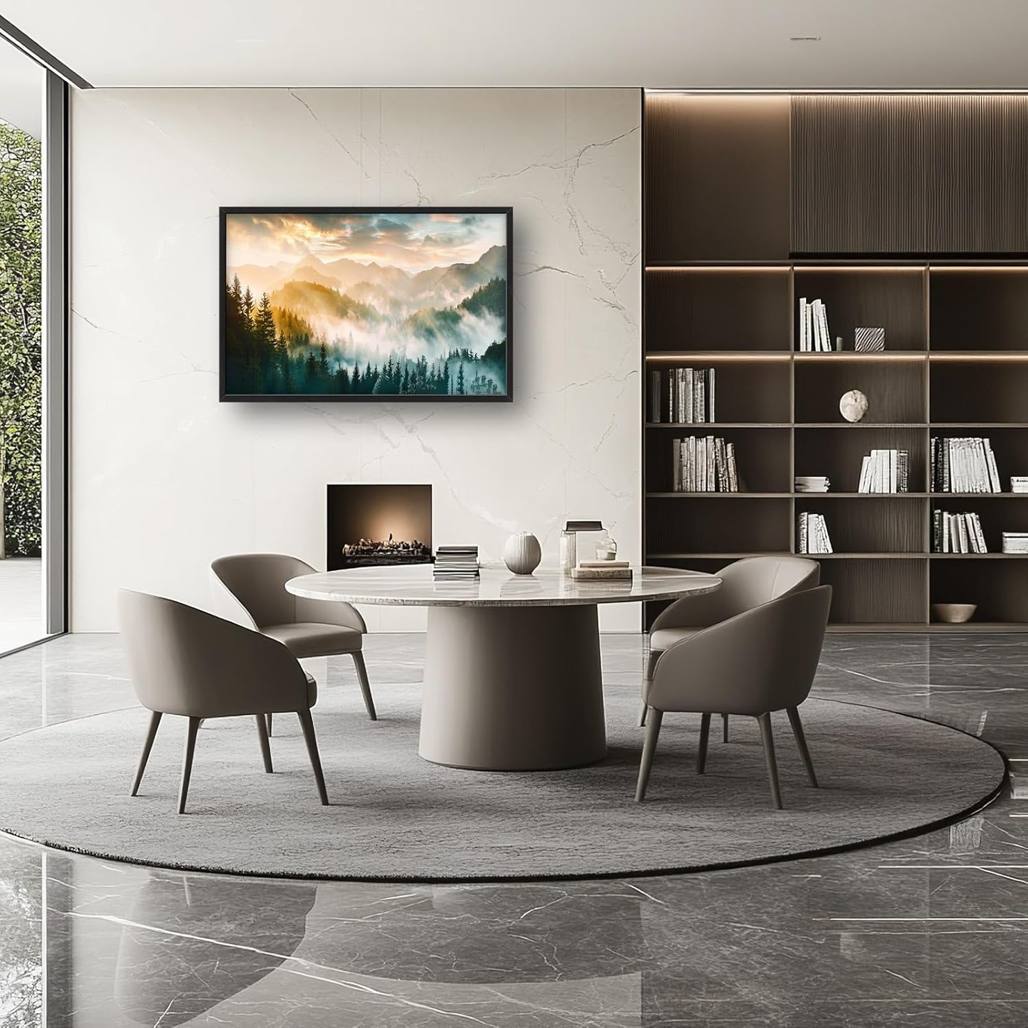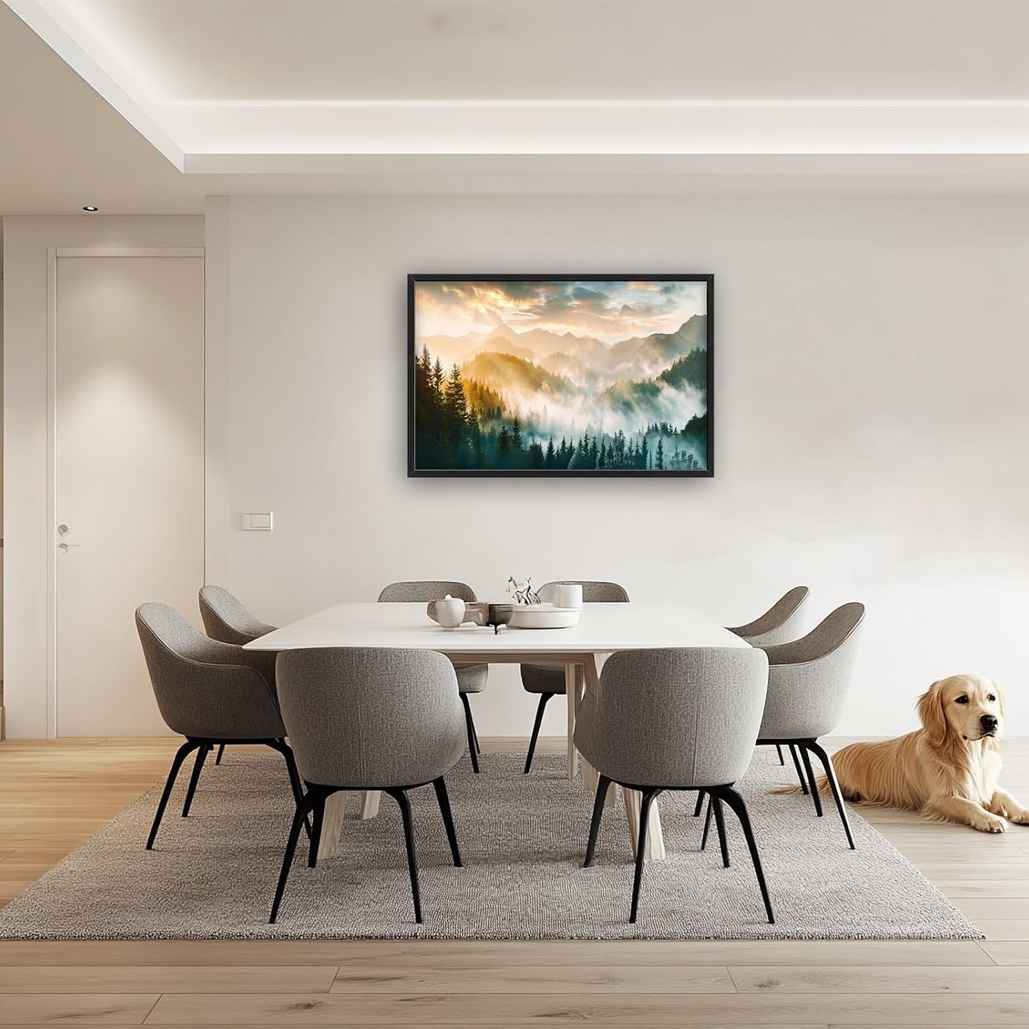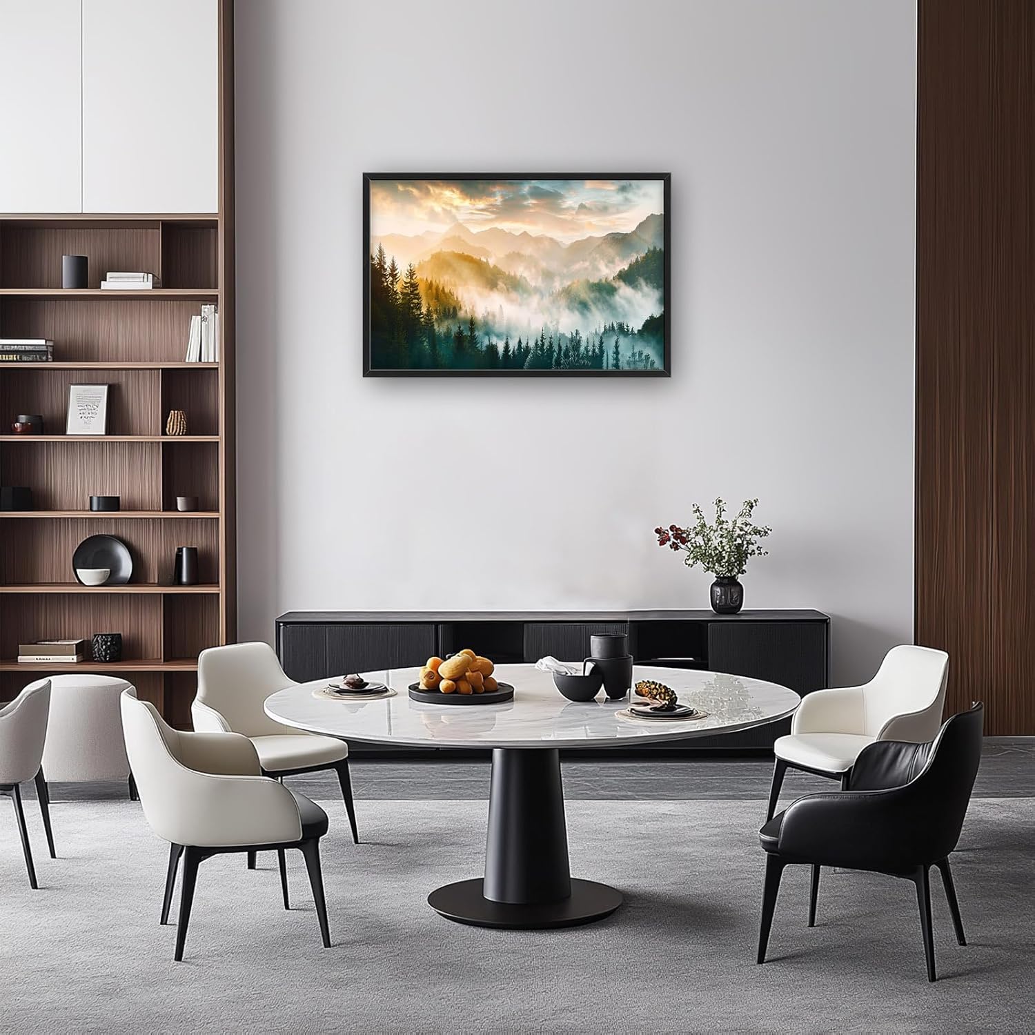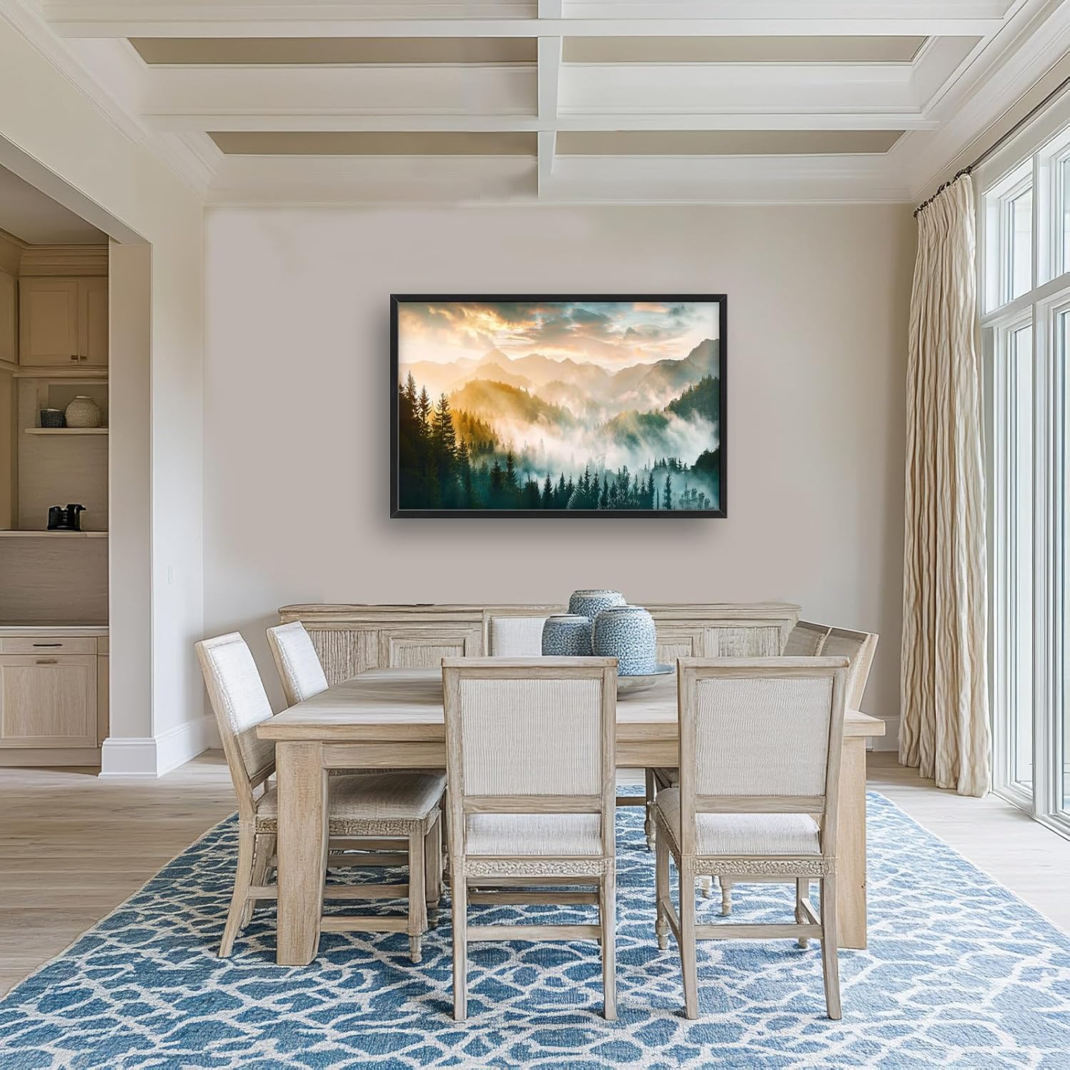 • 【Unique Design】A panoramic view of mist-covered mountains and dense forests, bathed in the soft glow of sunrise. The scene captures an enchanting atmosphere with ethereal clouds and gentle sunlight filtering through the trees.