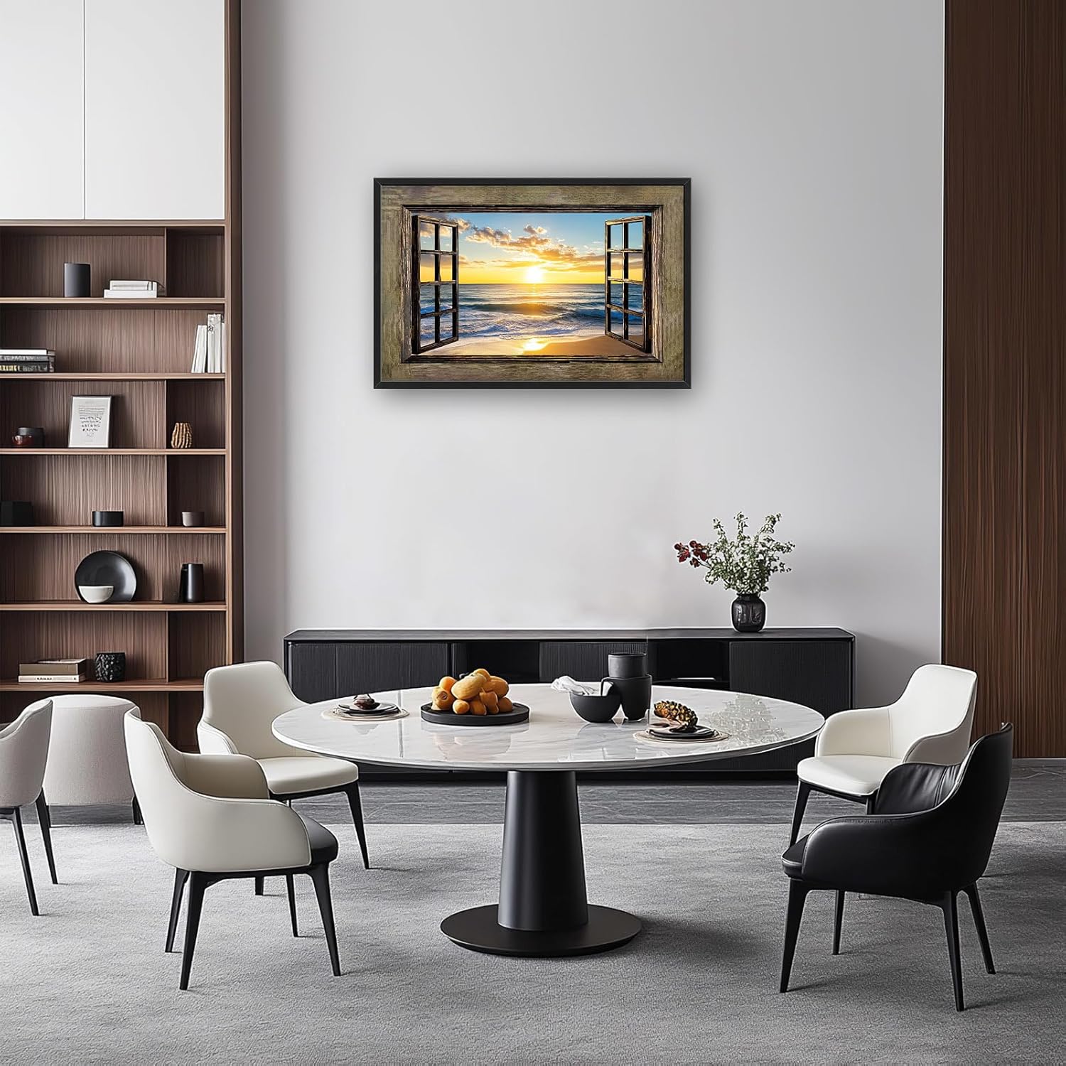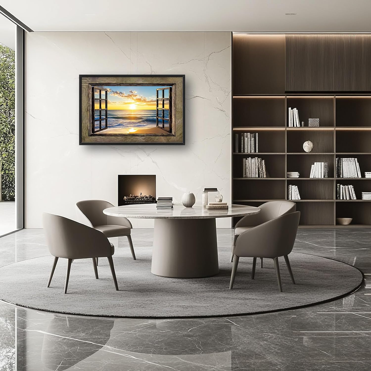 • 【Unique Design】A window frame with an ocean and sunset view, a beach scene with wooden frames, wall art for home decor, a beach landscape with open windows, photo-realistic, hyperrealism, high resolution.